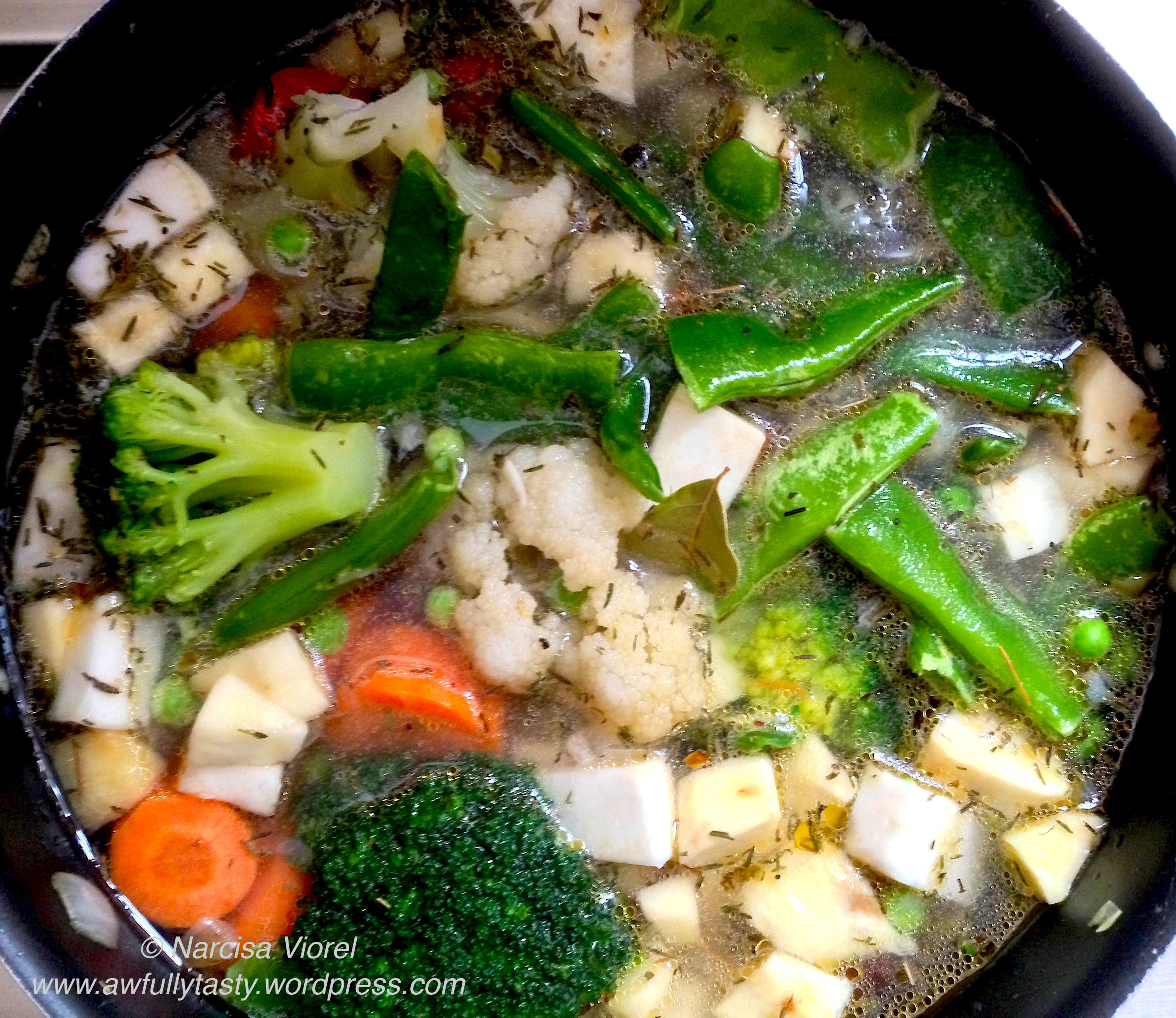 Tocăm ceapa și o călim în ulei până devine puțin aurie. Curățăm legumele și le tăiem cuburi. Le adăugăm peste ceapă și adăugăm apă caldă astfel încât să fie acoperite. Adăugăm cimbrul, dafinul și boabe de piper.