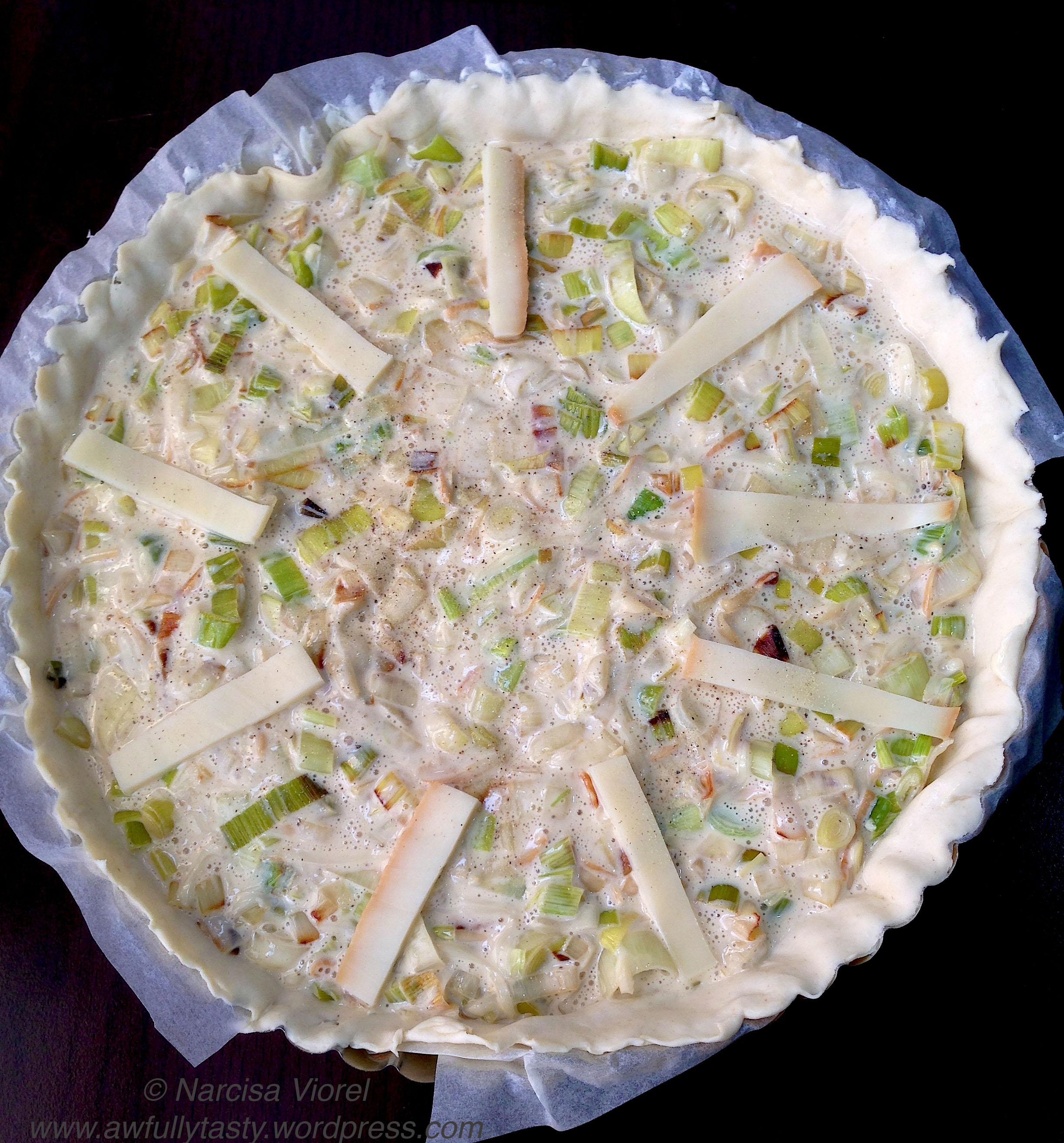 Tăiem prazul rondele și îl călim în unt timp de 10 minute. Într-un bol batem ouăle cu smântâna, chimionul, sarea, piperul și cașcavalul ras (am oprit puțin cașcaval pentru a presăra deasupra la final).