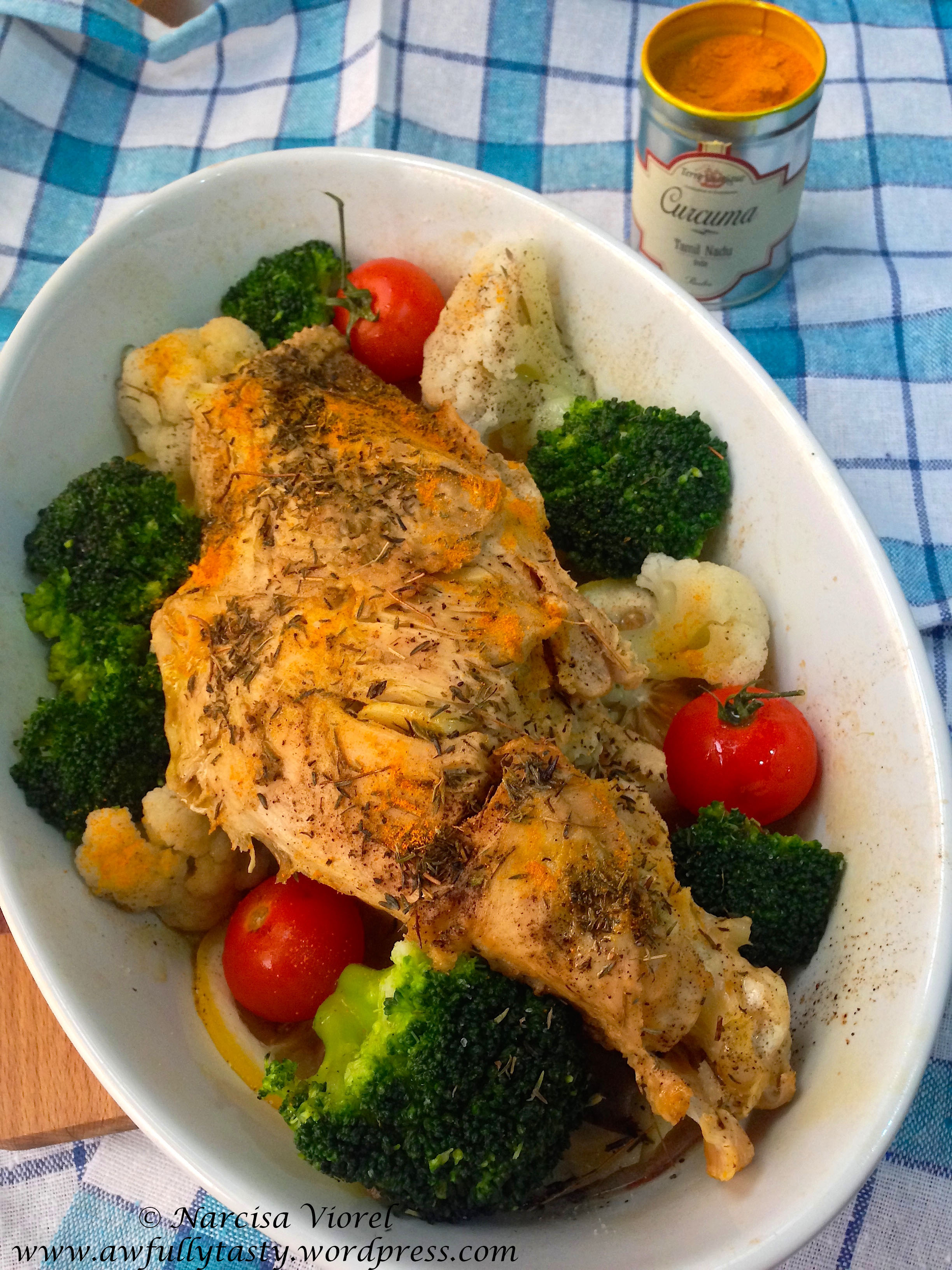 Scoatem din cuptor și adăugăm în tavă broccoli, conopida și roșiile cherry. Presărăm curcuma peste carne și legume, va da o culoare foarte frumoasă.