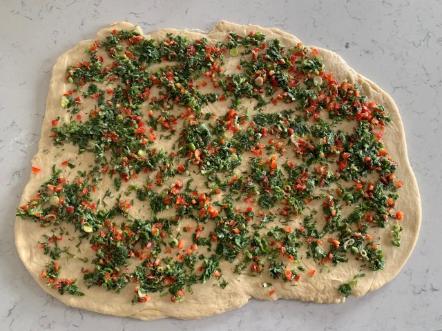 - Peste aluat punem compoziția de usturoi, o întindem bine să fie distribuită uniform.