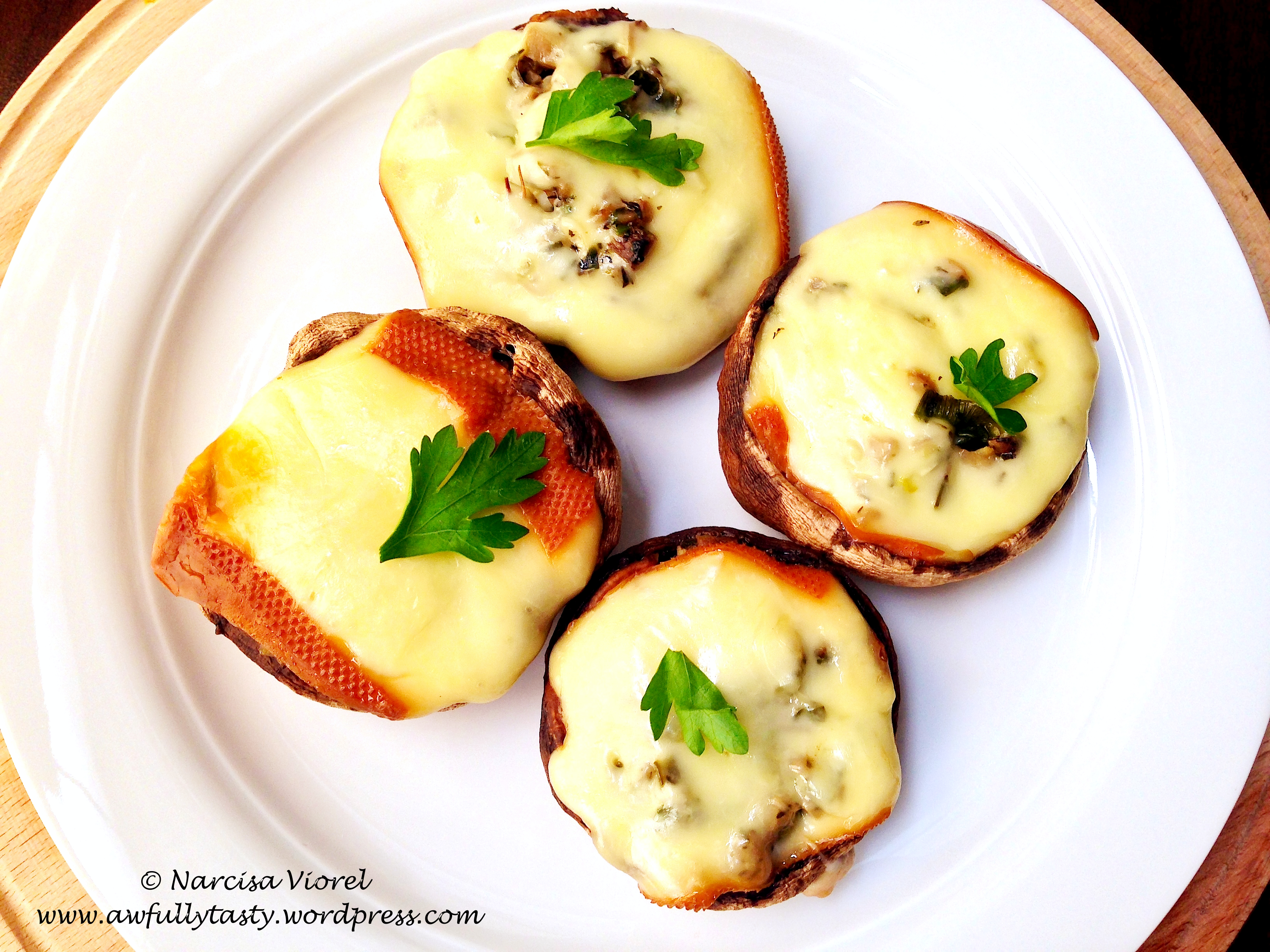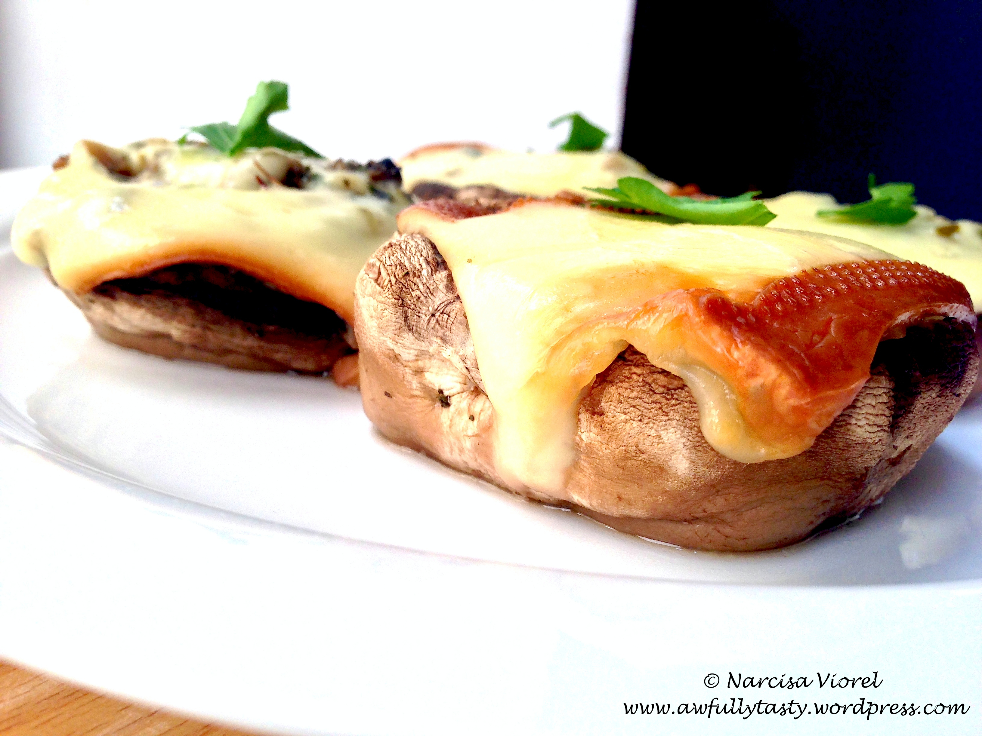 Deasupra așezăm câte o felie de cașcaval. Adăugăm vinul în tavă și dăm la cuptor la 180˚C pentru 40 de minute. Absolut delicioase, se pot servi cu o salată sau ca garnitură lângă o friptură.