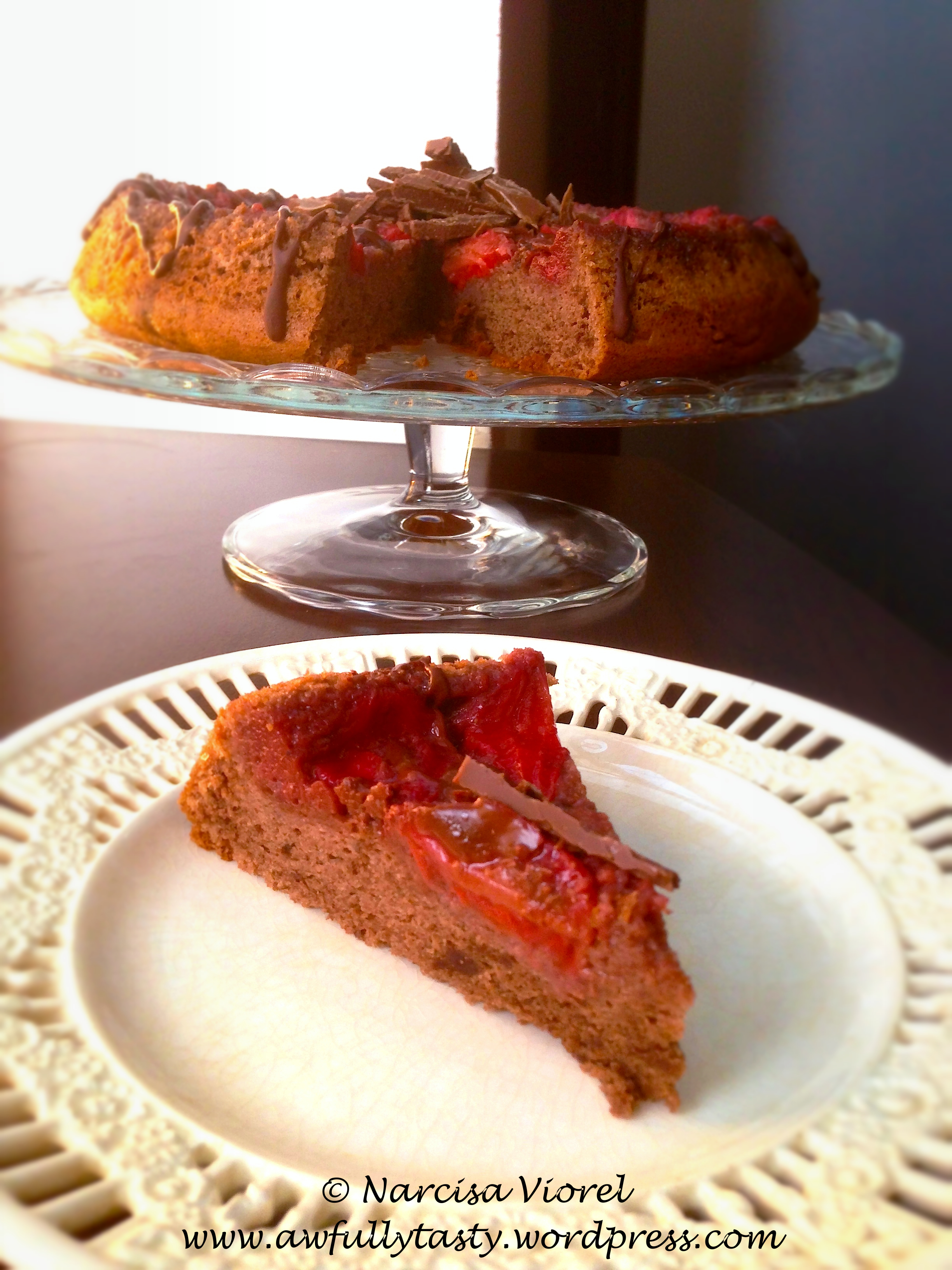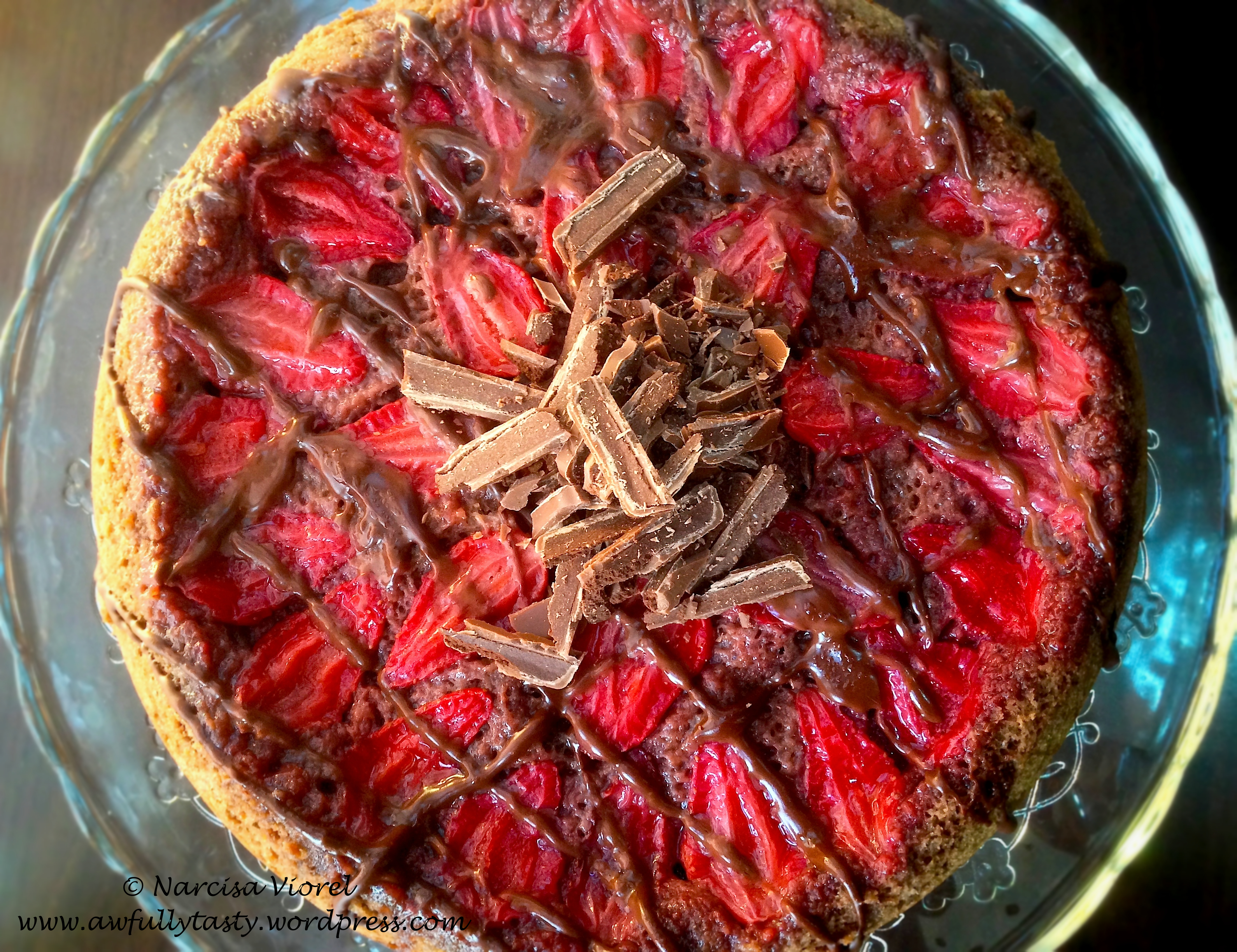 Batem albușurile spumă cu jumătate din cantitatea de zahăr. În alt vas mixăm gălbenușurile cu zahărul rămas, adăugăm pe rând uleiul, zeama de lămâie, praful de copt, cacaoa și făina. Încorporăm apoi albușurile bătute spumă. Turnăm în tavă, peste căpșuni și coacem 40 de minute sau până trece testul cu scobitoarea. Răsturnăm imediat prăjitura pe o farfurie și lăsăm la răcit.