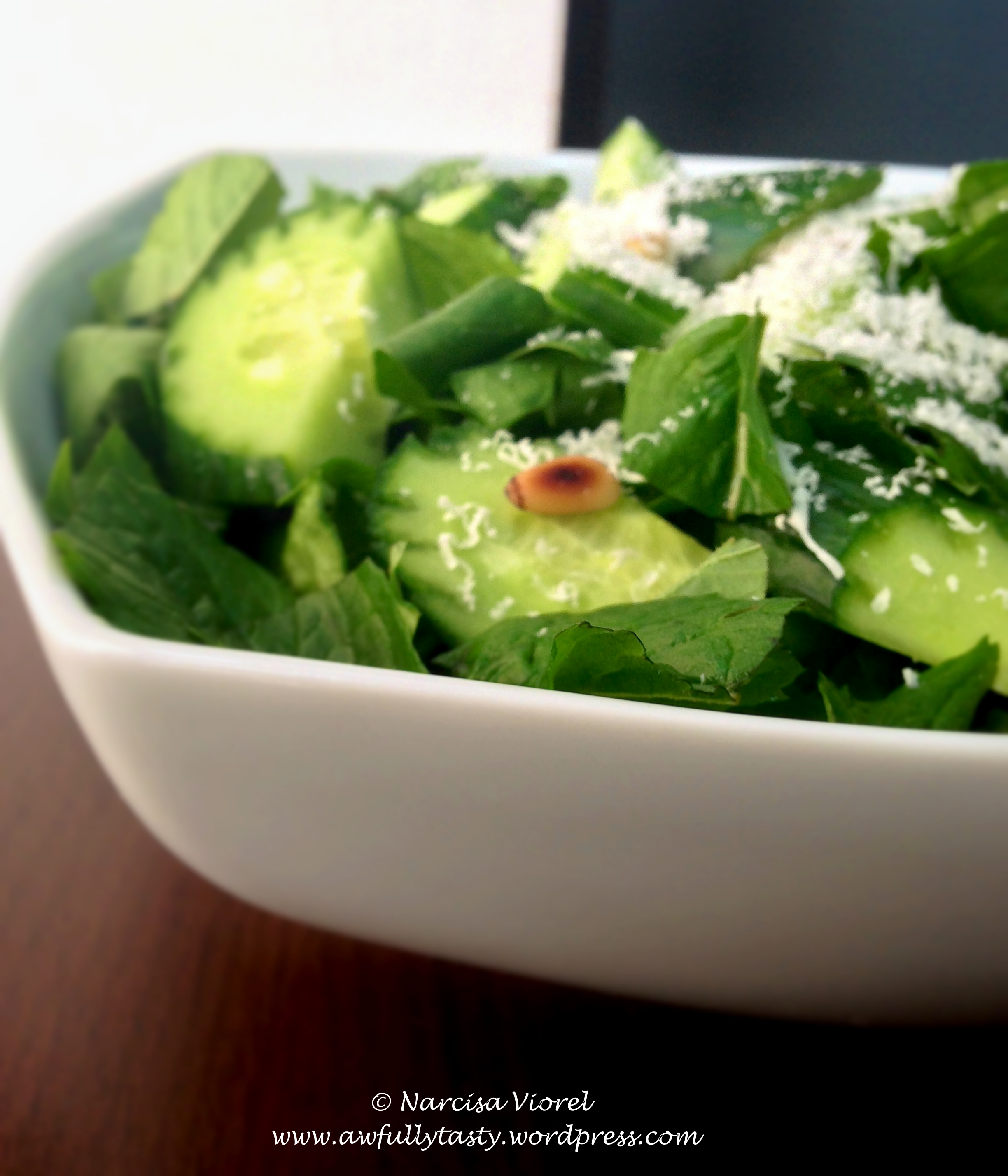 Tocăm spanacul fâșii de 1 cm lățime. Castravetele îl tăiem pe lungime pe jumătate, apoi felii oblice groase. Punem spanacul în bol peste vinegretă, iar peste spanac așezăm castravetele feliat. Presărăm parmezan ras, semințele de pin prăjite, frunze de mentă, sare și piper. Amestecăm salata înainte să o servim, pentru a rămâne proaspătă. E perfectă, menta și semințele de pin sunt aromele care dau toată nota acestei salate, nu cumva să renunțați la ele!