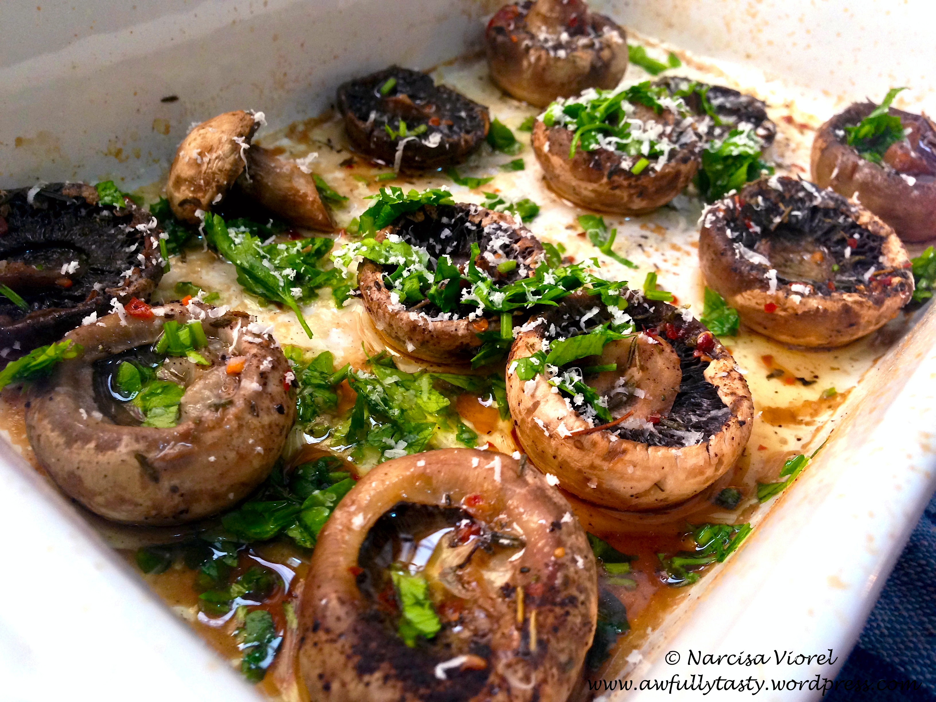 Am dat la cuptor cam 25-30 de minute la 180˚C. Se vor înmuia puțin când sunt gata. Am ras apoi puțin parmezan peste ele, direct în tavă și am presărat pătrunjelul. Au fost mâncate cât ai clipi, cu baghetă proaspătă! Foarte bune! Le puteți servi ca garnitură sau fel principal.