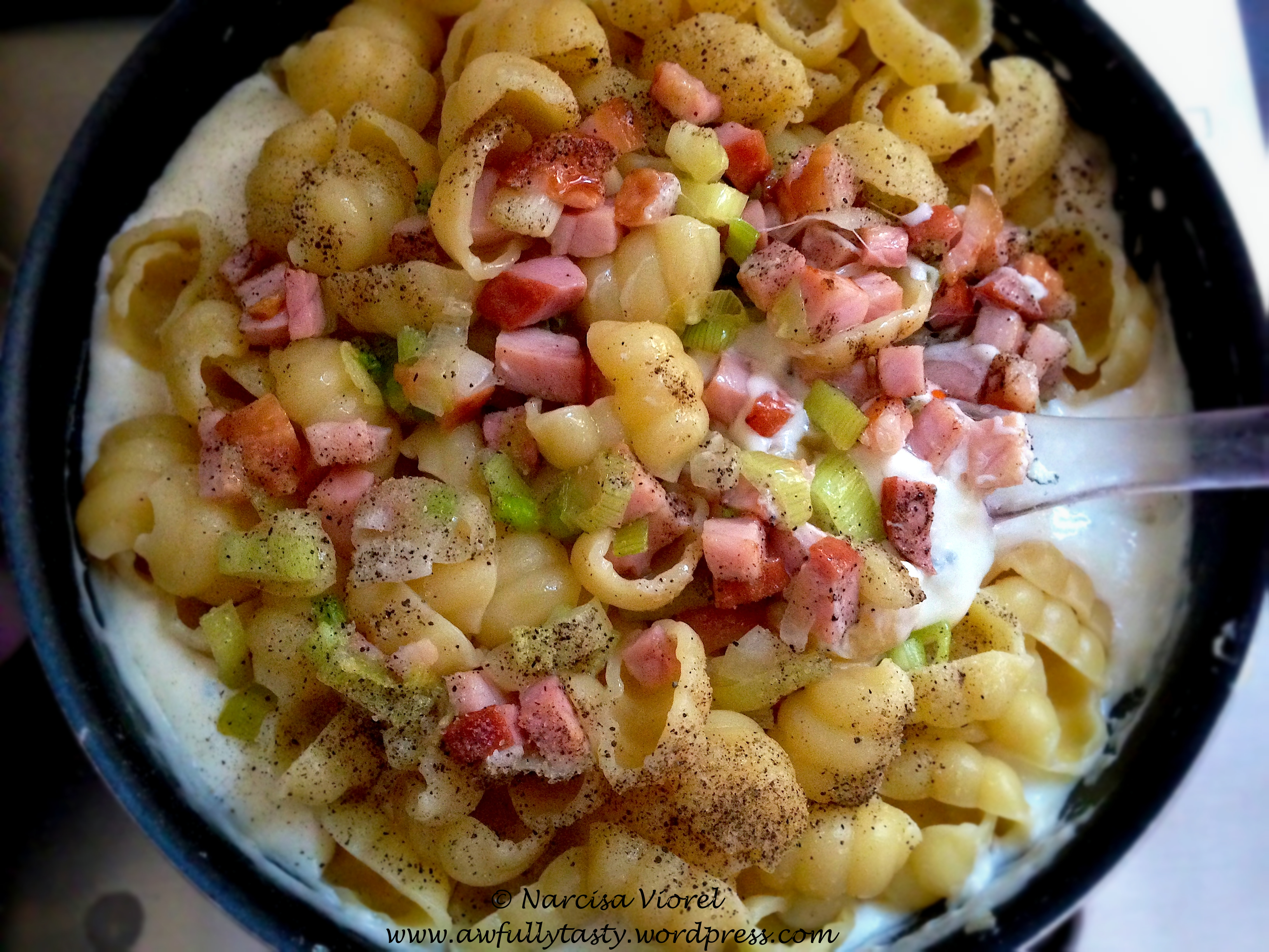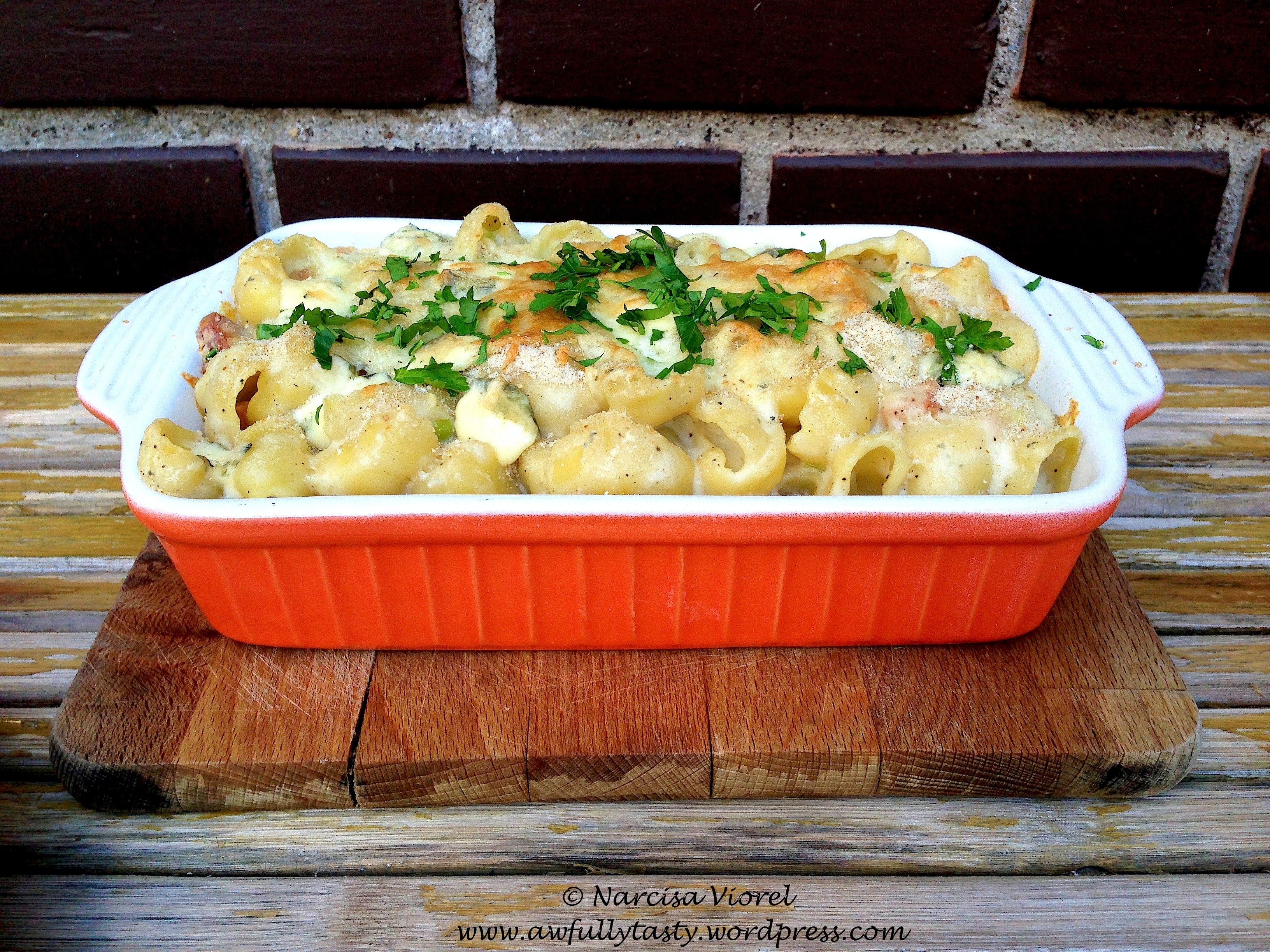 Fierbem pastele conform instrucțiunilor de pe ambalaj și le scurgem de apă. Călim ceapa feliată și baconul în 1 lingură ulei. Dăm deoparte când s-au rumenit ușor. Facem un rântaș din făină și unt, apoi adăugăm laptele câte puțin pentru a nu face cocoloașe. Amestecăm încontinuu până terminăm de adăugat tot laptele. Turnăm apoi și smântâna. Fierbem câteva minute până se îngroasă sosul. Adăugăm 3/4 din parmezan și 3/4 din gorgonzola. Amestecăm bine și încorporăm în sosul de brânză pastele și ceapa cu baconul. Asezonăm cu sare și piper, nucșoară și muștar.