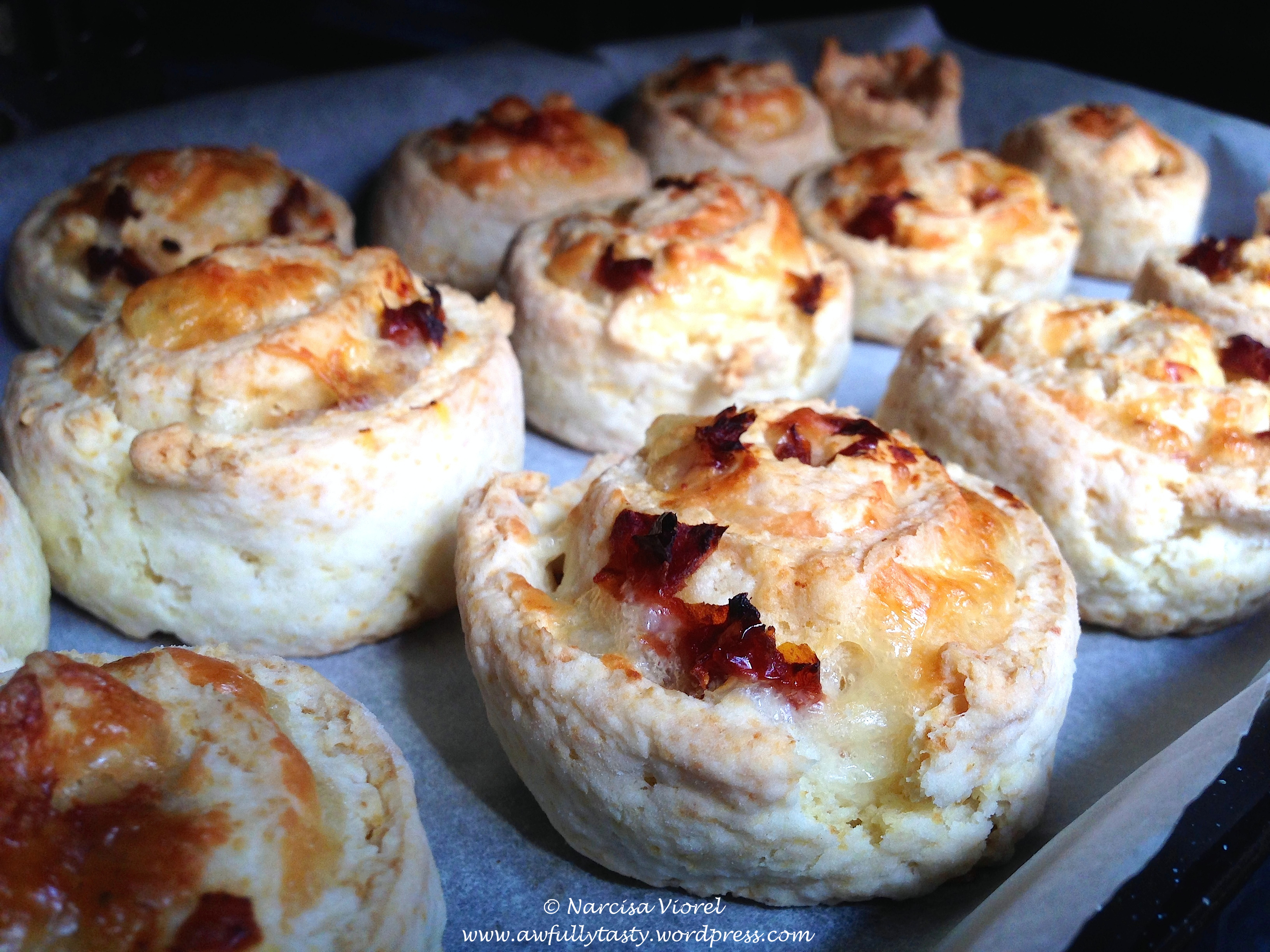 Întindem aluatul într-o foaie dreptunghiulară, presărăm cașcavalul ras și roșiile uscate, apoi rulăm pe lungime. Tăiem felii groase de un deget pe care le așezăm în tavă, la distanță una de alta.