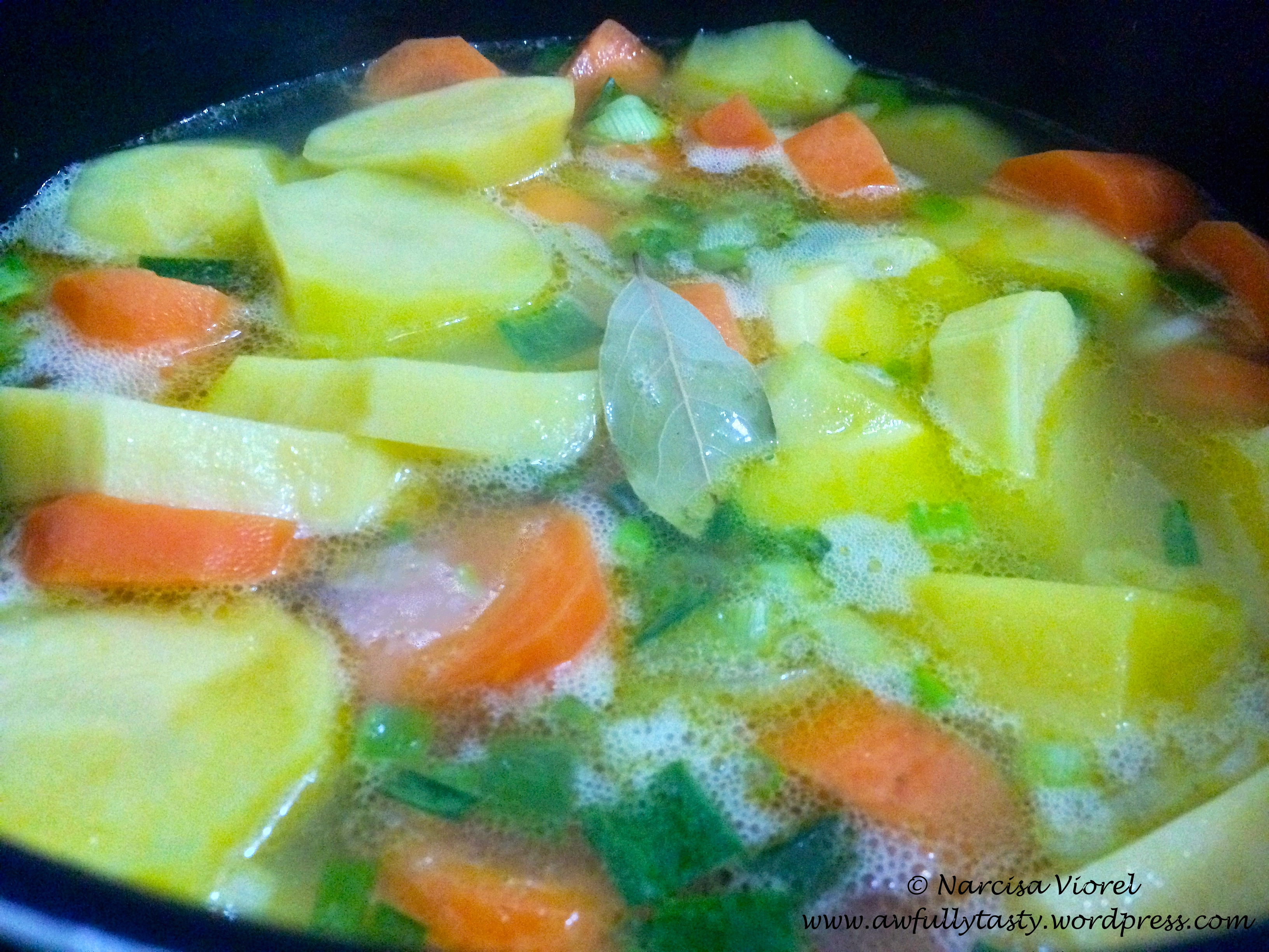 Punem la călit în 2 linguri de ulei ceapa verde feliată cu morcovii și cartofii tăiați cuburi/felii pentru 2-3 minute. Acoperim legumele cu apă caldă, adăugăm boabe de piper, frunza de dafin și fierbem aproximativ 25 de minute, până legumele s-au fiert bine de tot.
