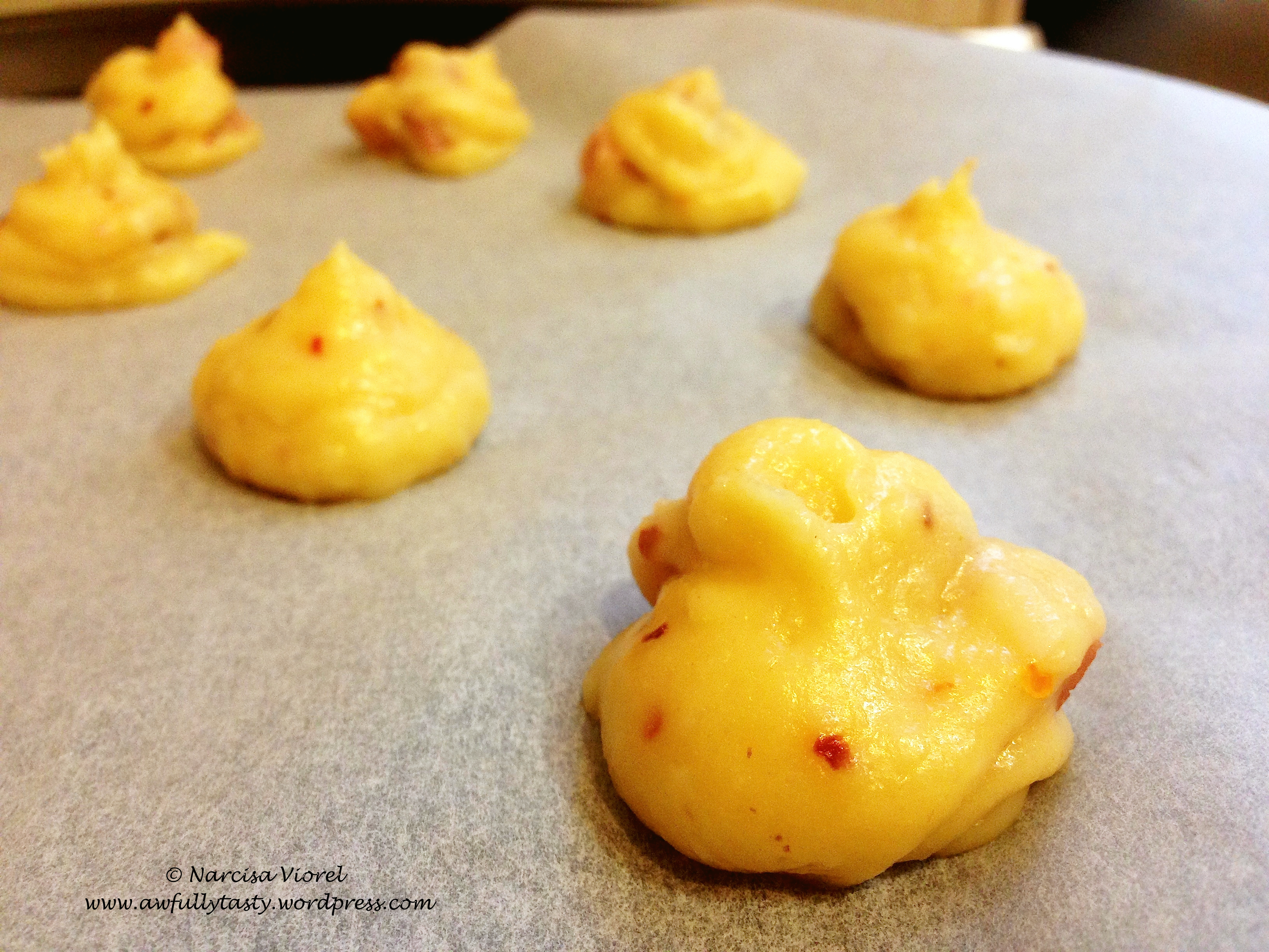 Încălzim untul și laptele într-o crăticioară. Tocăm mărunt baconul și îl rumenim într-o tigaie teflonată, apoi îl punem pe un șervet de hârtie să se scurgă de grăsime. Într-un alt bol amestecăm făina, sarea, parmezanul și chilli. Când laptele fierbe, luăm de pe foc și adăugăm făina cu amestecul de ingrediente. Amestecăm bine de tot cu o lingură de lemn sau o spatulă, până se omogenizează toate ingredientele. Lăsăm la răcit puțin, cât să putem ține mâna pe compoziție dacă o atingem. În acest moment adăugăm un ou, amestecăm din nou foarte energic până se încorporează, apoi adăugăm și al doilea ou. Amestecăm din nou. În final, adăugăm baconul rumenit.