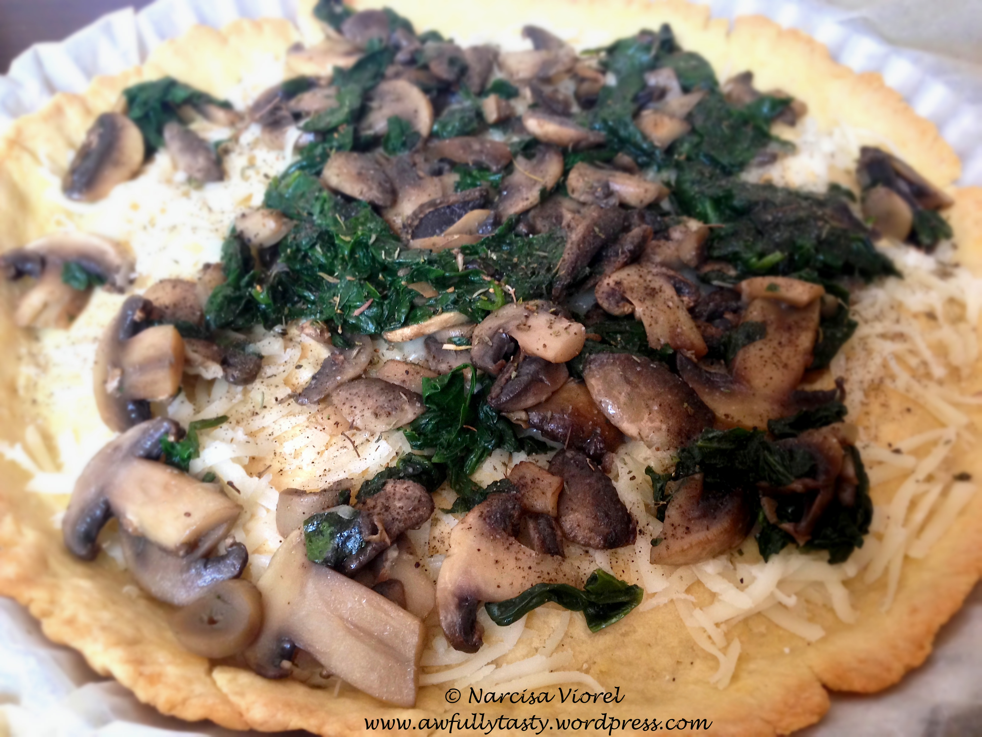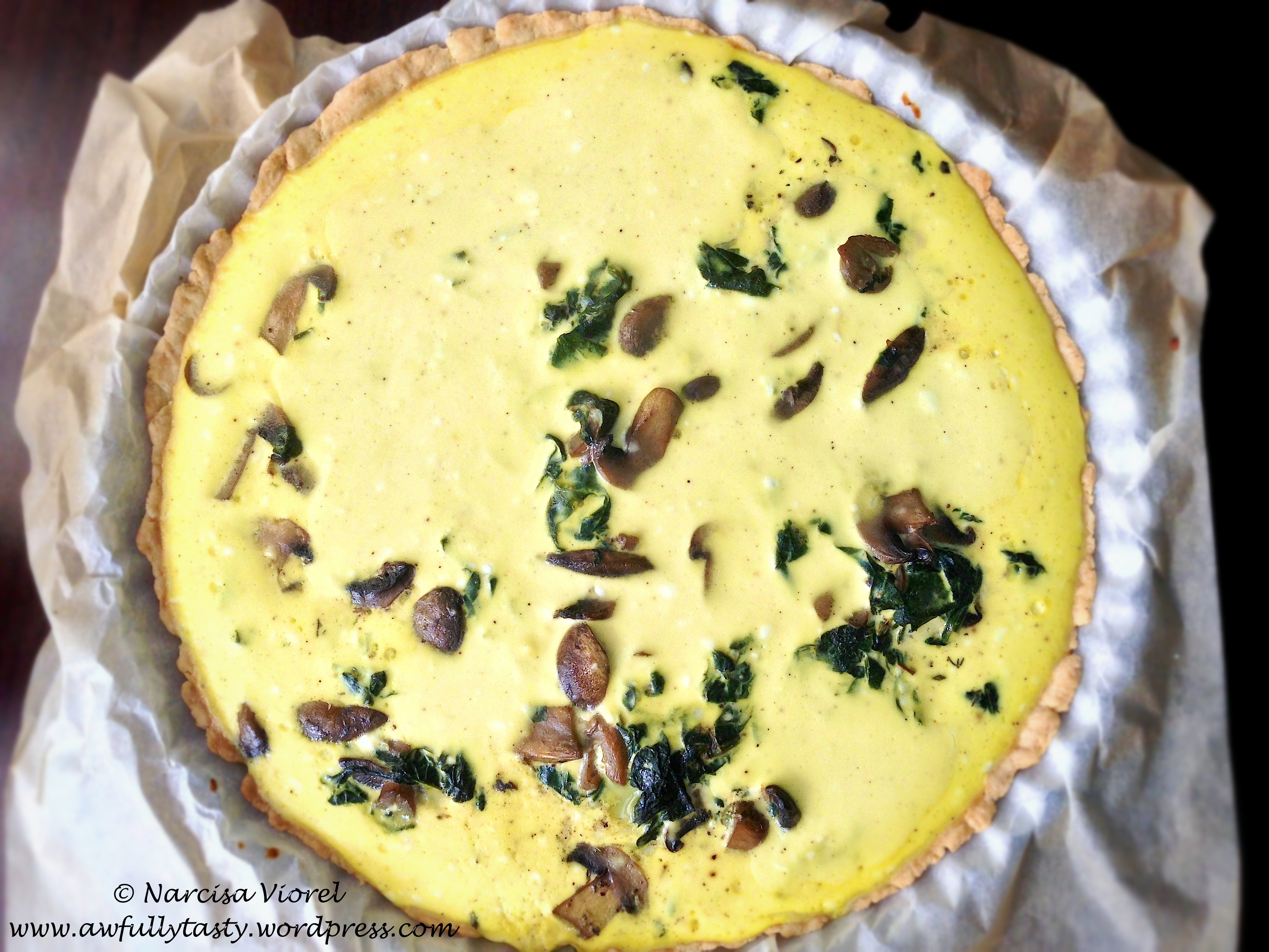 Călim ciupercile și spanacul în 2 linguri de ulei până se înmoaie. Batem ouăle, adăugăm laptele și smântâna, sare și piper. Scoatem aluatul din cuptor și presărăm cașcavalul. Peste acesta adăugăm ciupercile și spanacul.