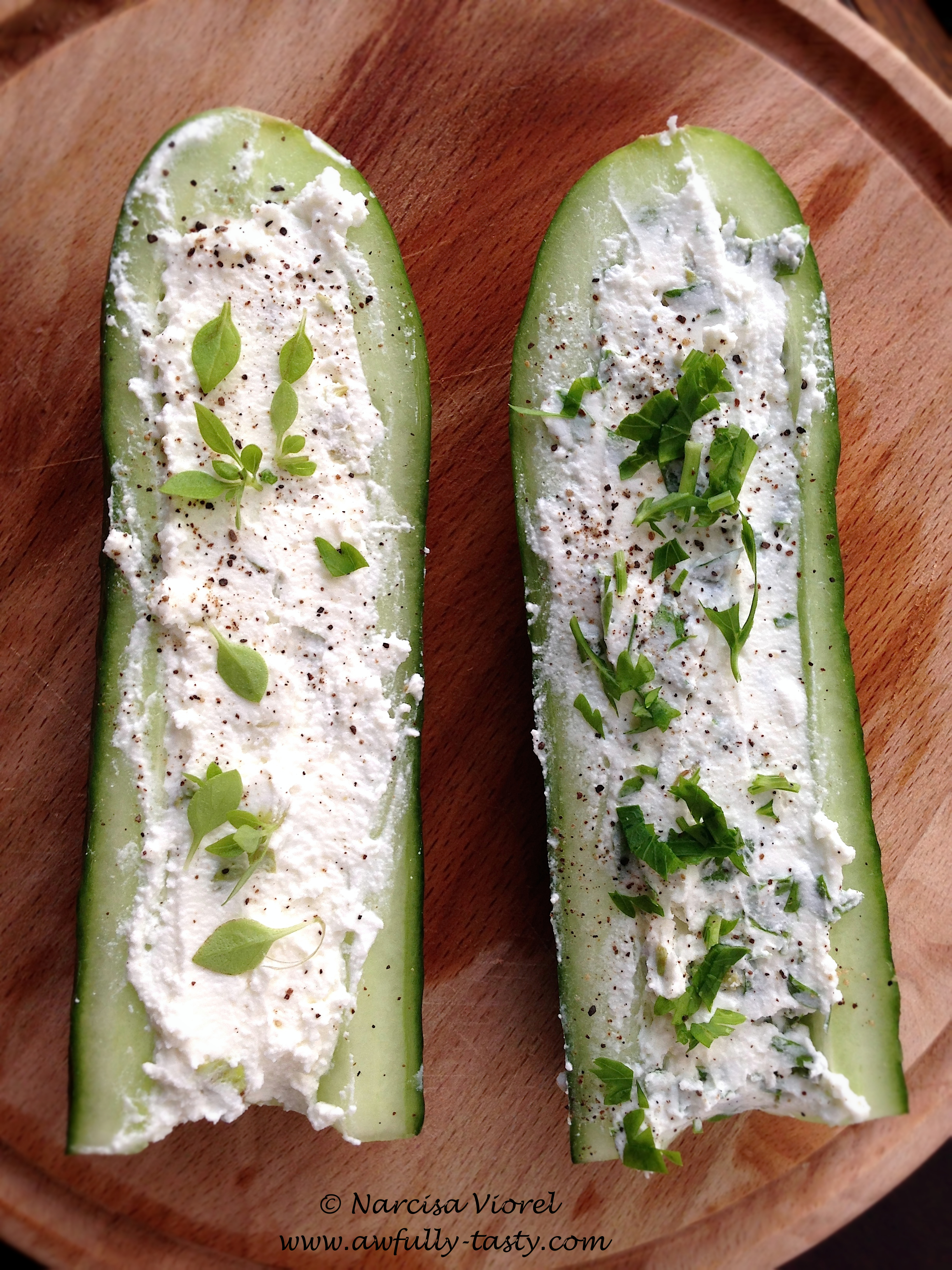 Tăiem castravetele pe lungime și cu o linguriță îndepărtăm miezul. Tocăm mărunt verdeața și o amestecăm cu feta. Umplem castravetele cu crema de brânză și presărăm piper. Tăiem felii castravetele și îl mâncăm pe post de aperitiv, simplu sau lângă alte aperitive, ouă, bruschette, etc.