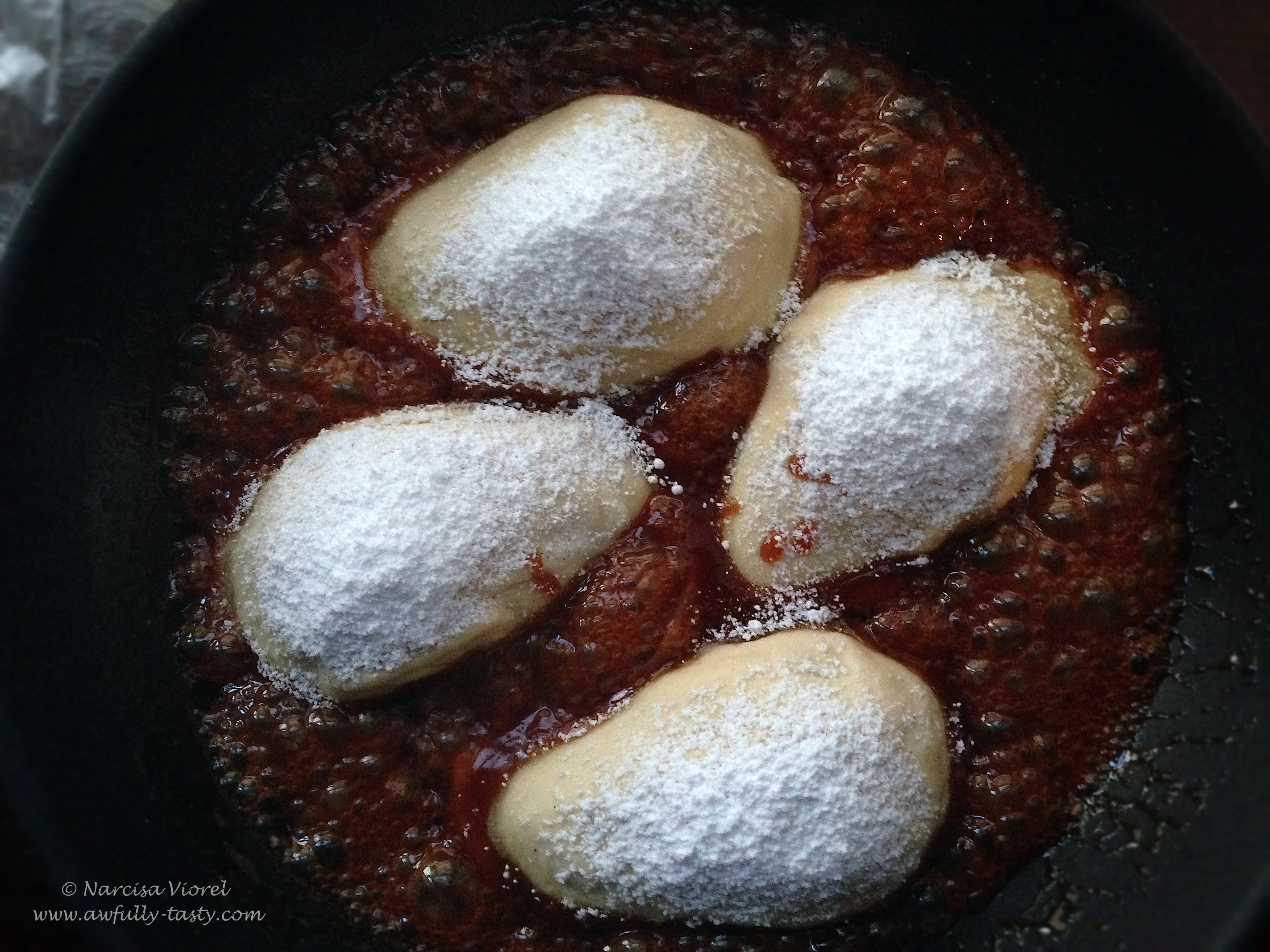 Le așezăm cu partea tăiată în jos pe masă, punem foietajul peste pere, presăm ușor să se așeze bine și decupăm foietajul. Încingem o tigaie, adăugăm zahărul și îl topim, doar cât să devină puțin auriu, adăugăm untul, amestecăm să se topească, apoi adăugăm romul (dacă folosiți chiar rom alcool, aveți grijă când flambați). Adăugăm perele în tigaie, cu partea tăiată în sos, pudrăm rapid cu zahăr pudră toată suprafața foietajului și dăm la cuptor pentru 8-10 minute.