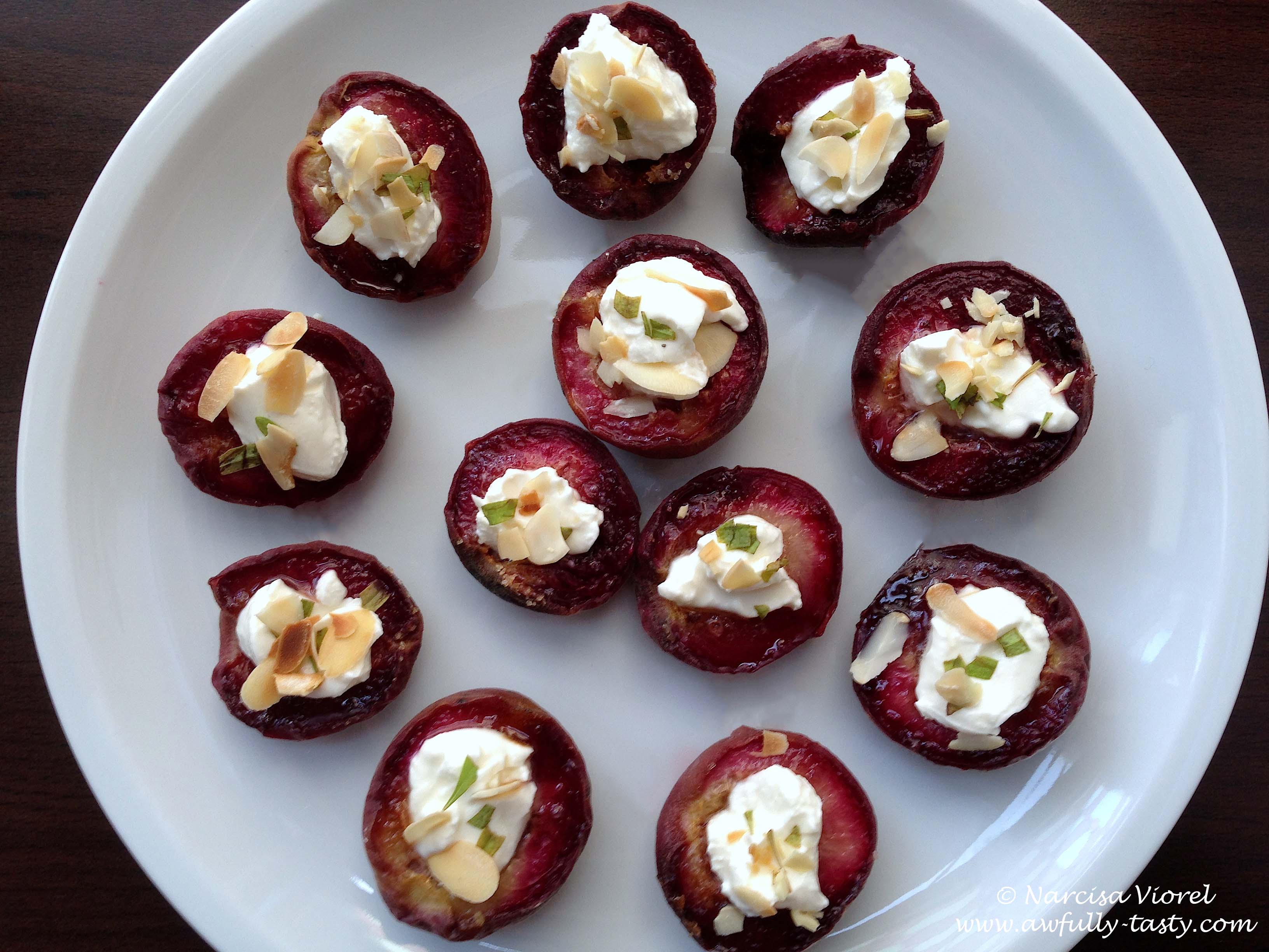 Încălzim cuptorul la 200˚C pe funcția grill. Piersicile fără sâmburi, tăiate pe jumătate se înmoaie cu partea tăiată în zahărul brun. Le punem într-o tavă, însă de data asta cu partea tăiată în sus și le coacem 8-10 minute, până ce zahărul se topește și se rumenesc ușor. Le scoatem din cuptor, punem câte 1 vârf generos de linguriță de cremă de brânză, presărăm cimbrul proaspăt și fulgii de migdale. Servim. Delicios, savuros, sublim.