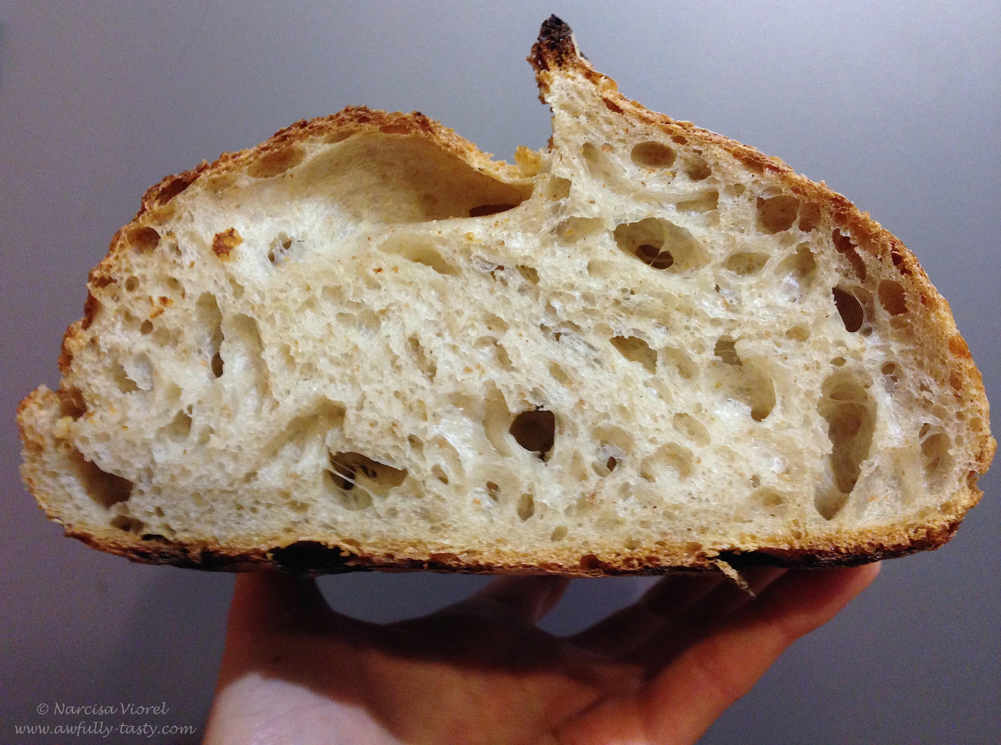M-am înscris nerăbdătoare la atelierul organizat de Codruța Popa (Codru de pâine) în urmă cu vreo săptămână. O știam doar din spatele blogului superb pe care îl are, unde vezi niște pâini de zici că nu-s adevărate. Am citit blogul pas cu pas, la început nu înțelgeam mai nimic, nu știam de e ala SF, autolyse, scoring, nici măcar maia sălbatică nu aveam habar ce înseamnă. Încet-încet am înțeles și am devenit curioasă, inclusiv mi-am făcut prima maia sălbatică. Am încercat să fac și pâine, dar am testat niște rețete foarte simple, fără maia sălbatică și fără prea multă frământare. Când am văzut că urmează să țină un nou atelier de pâine unde aveau acces și începători, m-am înscris cât ai clipi.