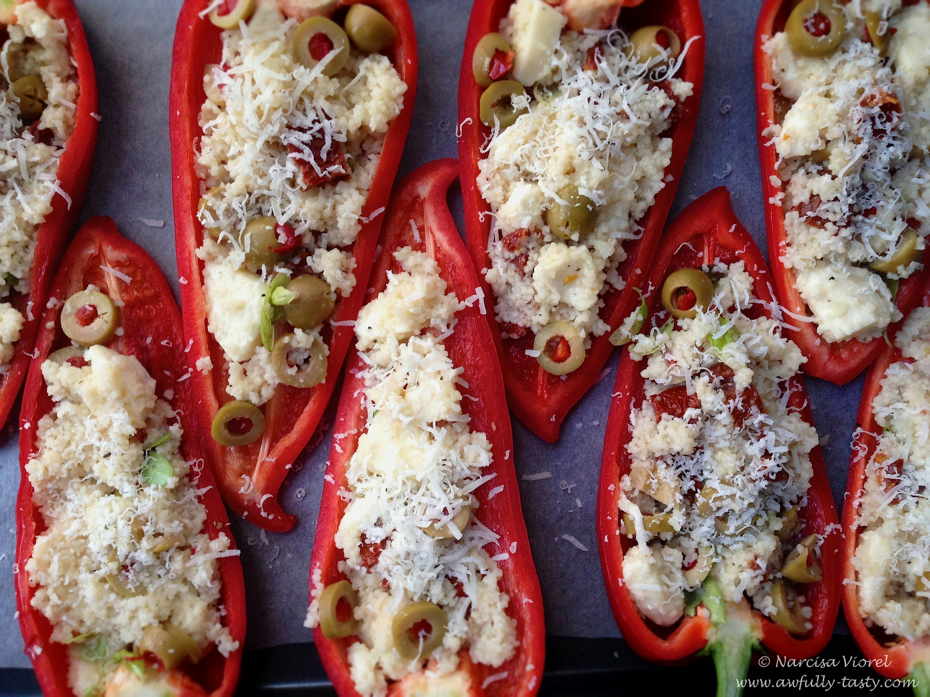 Încingem cuptorul la 180˚C și pregătim o tavă întinsă pe care eventual punem hârtie de copt. Tăiem ardeii pe lungime pe jumătate și îndepărtăm semințele. Îi așezăm în tavă. Într-un bol ametecăm couscous-ul cu 100 ml apă fierbinte, acoperim vasul și îl lăsăm 10 minute deoparte. Tăiem mozarella bucăți, împreună cu roșiile uscate. Feliem și măslinele. Amestecăm apoi couscous-ul cu mozzarella, roșiile uscate, măsline, frunzele de busuioc, sare și piper. Umplem ardeii cu acest amestec și preăsăm puțin parmezan ras deasupra. Coacem 30-35 de minute, până devin ușor rumeni la suprafață. Foarte buni, light și aromați!