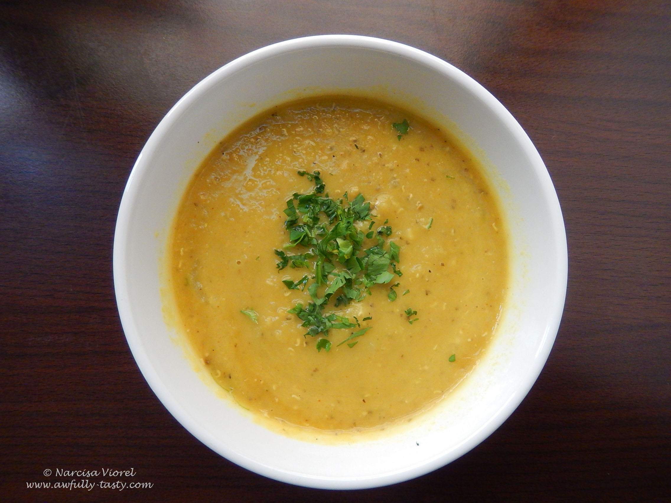 Mutăm supa într-un blender sau folosim un mixer vertical și procesăm până obținem un pireu. Asezonăm cu coriandru/pătrunjel și zeamă de lămâie înainte să servim supa.