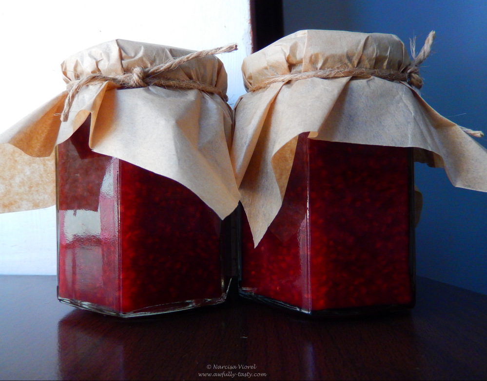 Am primit o caserolă de zmeură de la mama, zmeură de grădină, din curtea casei mele. Pentru că a făcut drum lung și s-a cam distrus, am decis să o fac dulceață. Am obținut 2 borcane prețioase 🙂
