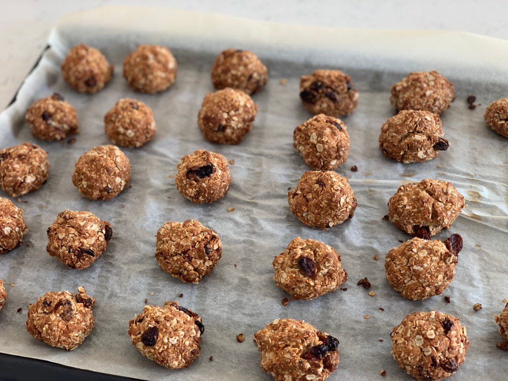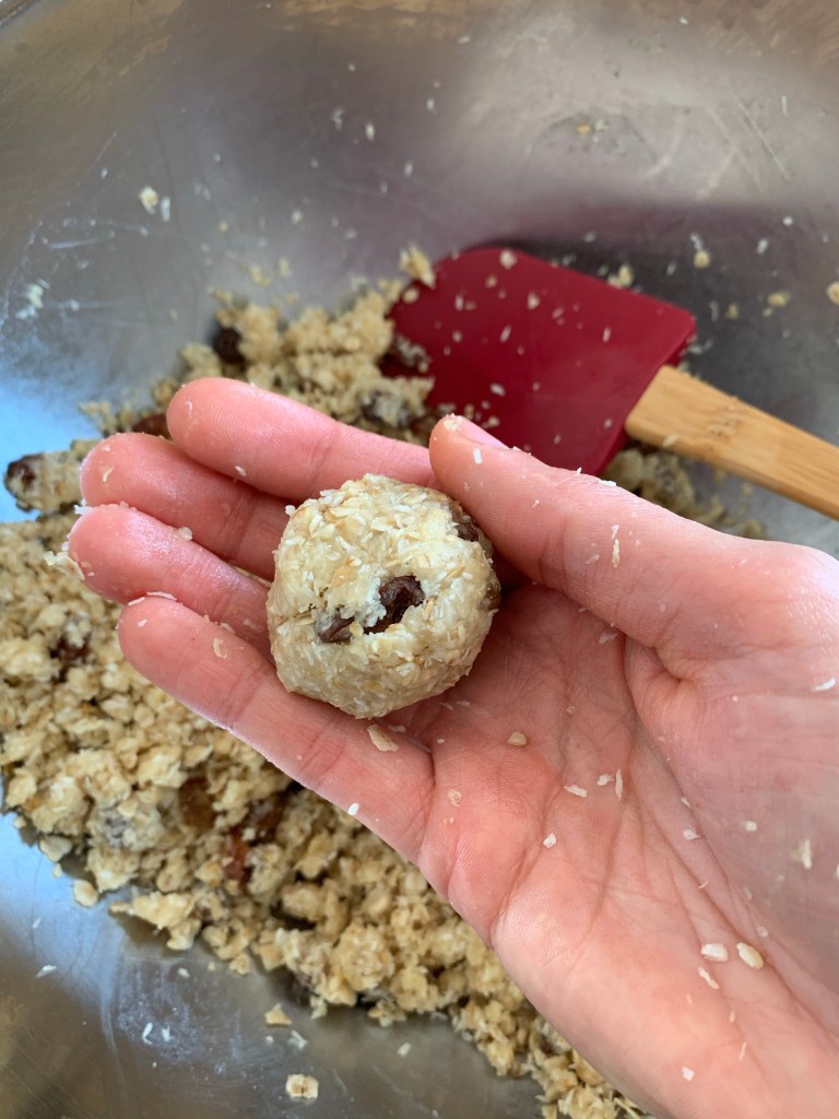 5. Pregătim tăvi cu hartie de copt și cu ajutorul palmelor formăm cookies-urile. Strângem bine compoziția în mână până ce formăm grămăjoare cât o nucă.