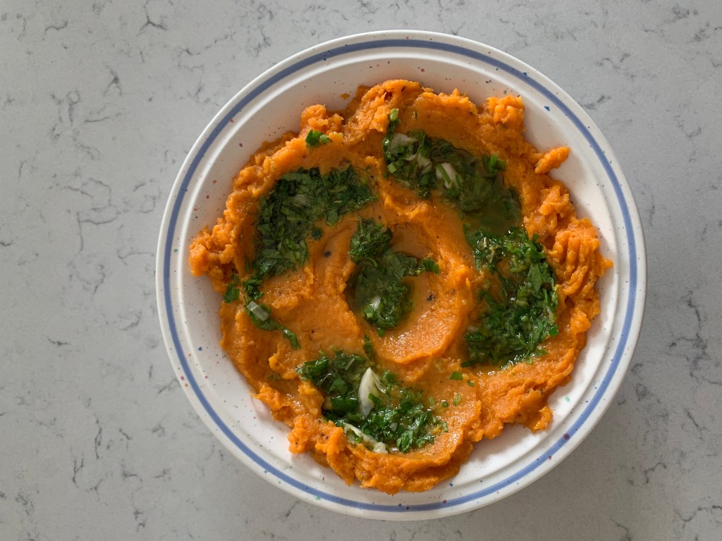 3. Curățăm cartofii dulci de coajă și îi punem într-un bol. Îi zdrobim cu furculița și asezonăm cu sare și piper.