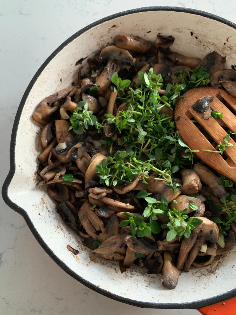 - În momentul când am terminat de sotat ultima tranșă de ciuperci, le adăugăm înapoi în tigaie și pe cele din farfurie, împreună cu usturoiul și ceapa verde.
