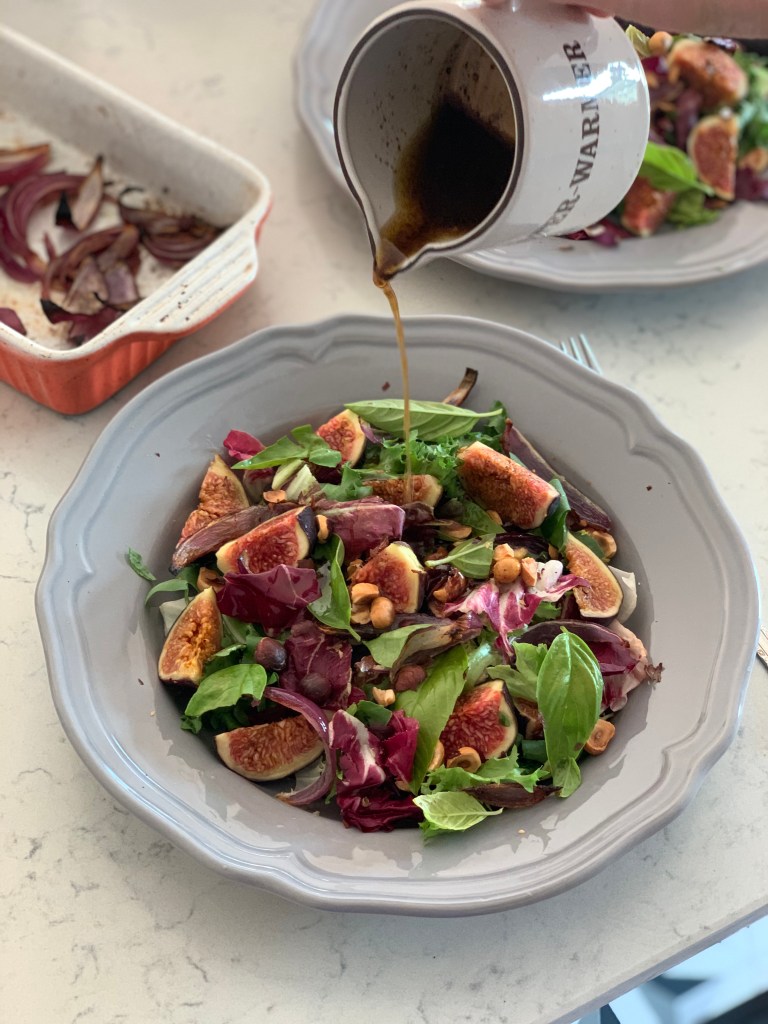 5. Pe un platou așezăm frunzele de radicchio, salata, smochinele feliate, ceapa coaptă.