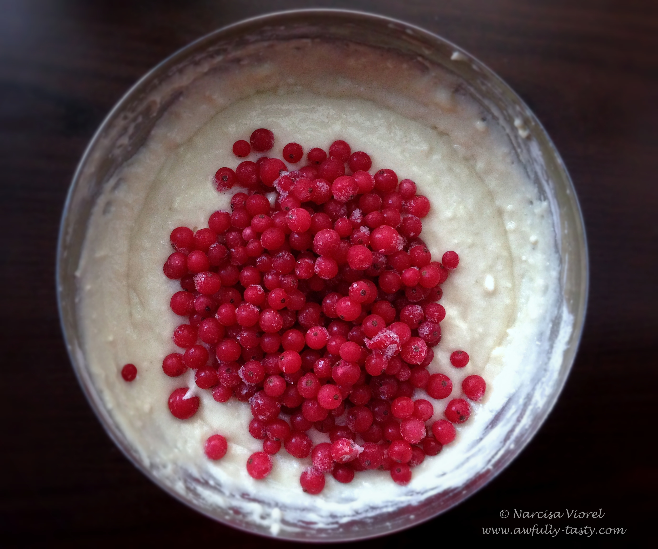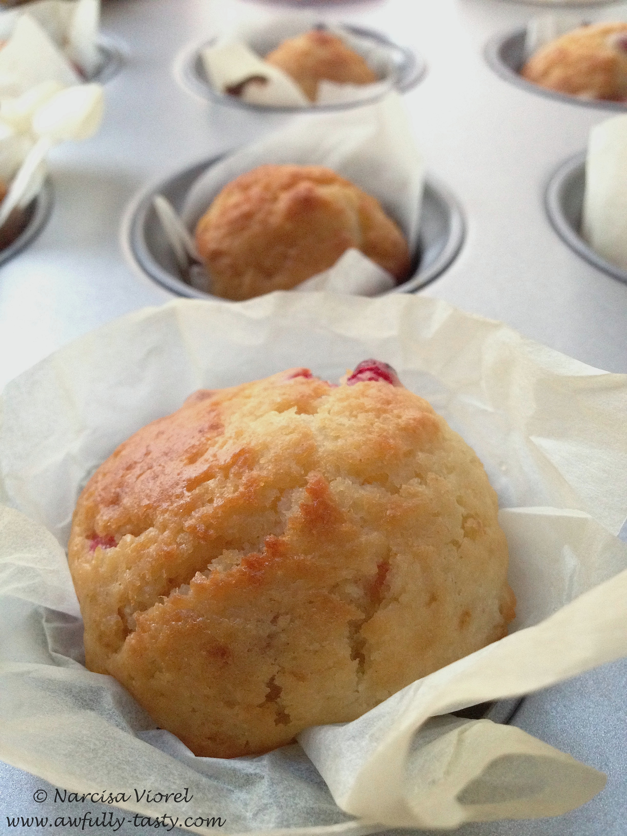 Amestecăm ușor și umplem formele de brioșe cam trei sferturi, pentru că vor crește. Le coacem aproximativ 25-30 de minute, până devin ușor aurii. Eventual le încercați cu scobitoarea. Eu am folosit o tavă nouă cu altă formă decât cea obișnuită, din acest motiv sunt mai înalte. Sunt super bune! Au un miez umed, aromat, cu note acrișoare de la fructe.
