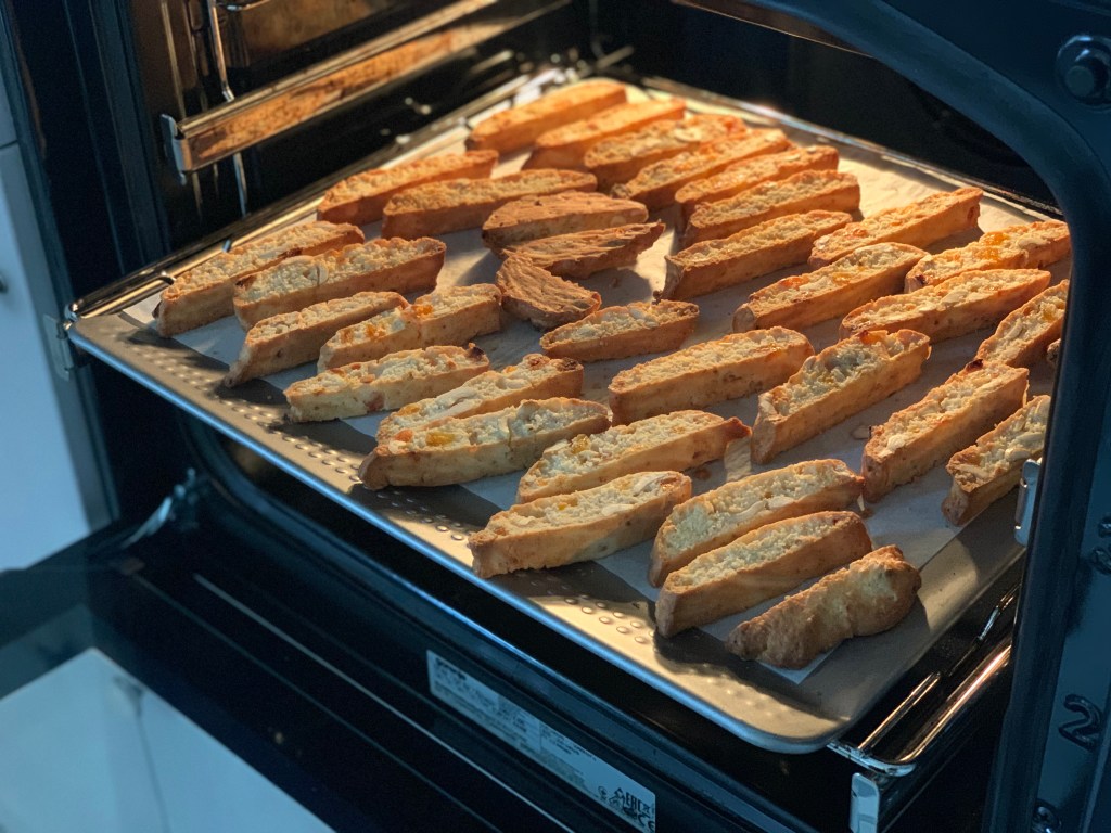 - Se feliază pe diagonală în bucăți de 1 cm, se pun din nou pe tavă și se coc câte 5 min pe fiecare parte (se scot și se întorc după primele 5 minute).