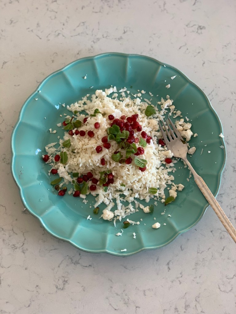 2. Dăm pe răzătoare 1/3 din conopidă și o punem într-un bol împreună cu frunzele de mentă, pătrunjel, semințele de rodie, sucul de lămâie, chimion și fistic.