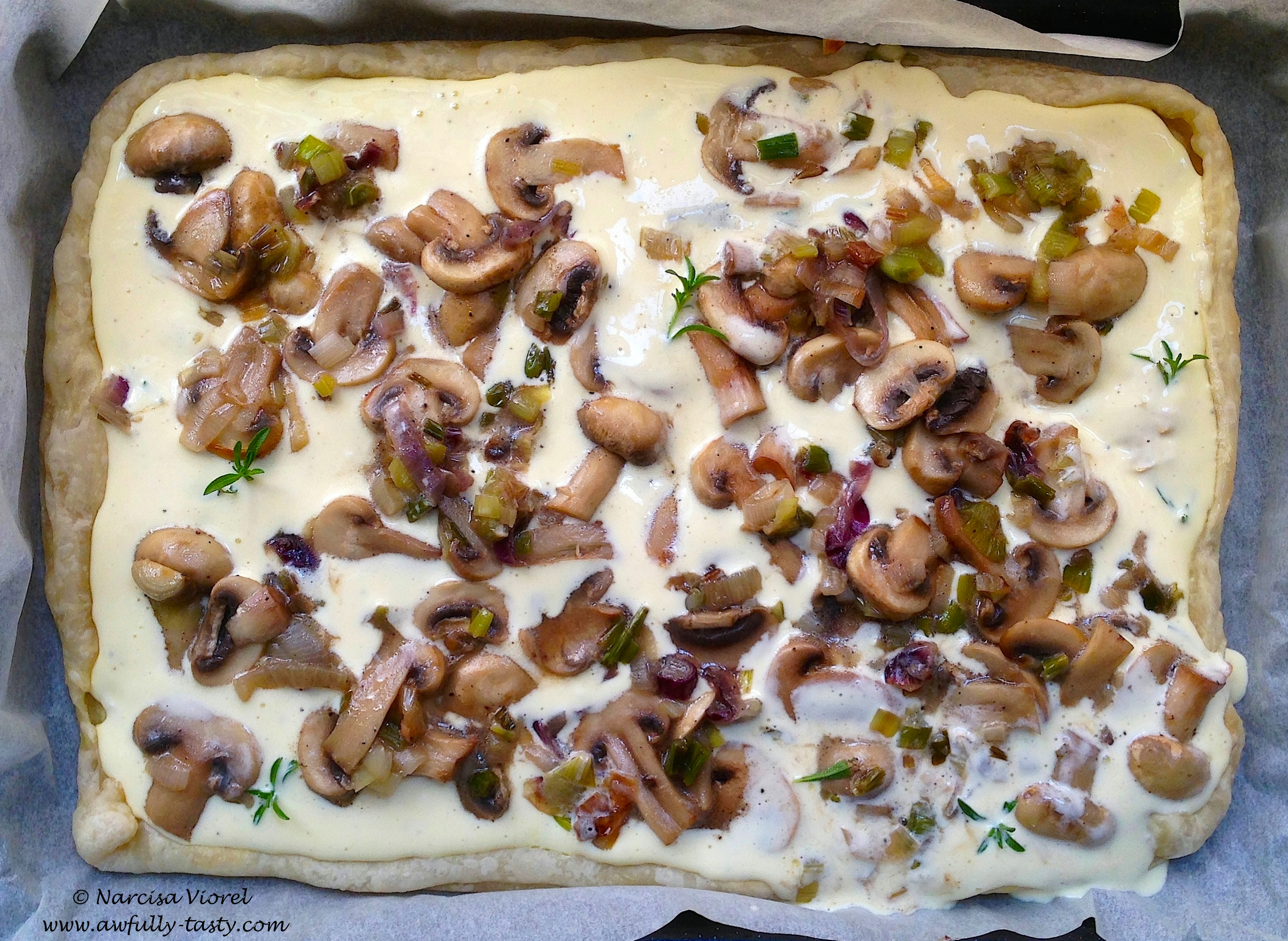 3. Luați de pe foc, adăgați restul ingredientelor (fără ciuperci), amestecați bine și turnați în crusta de aluat.
