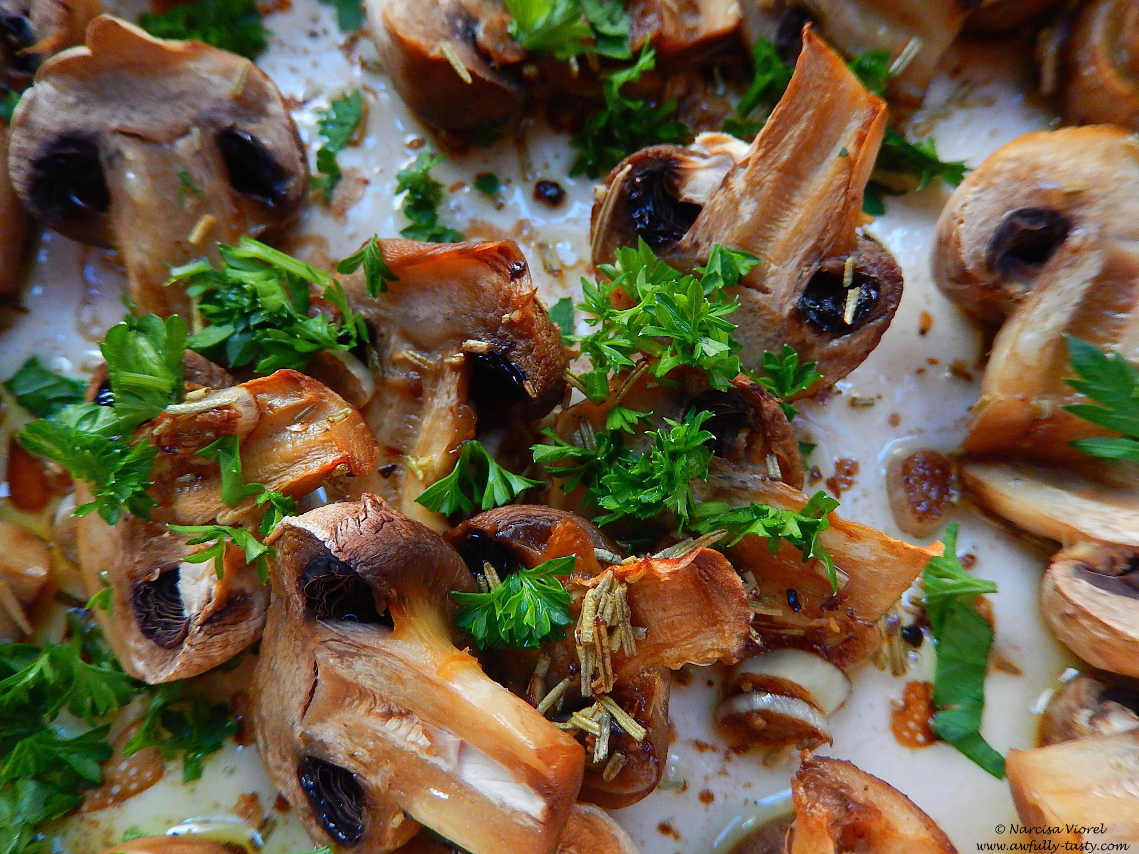 4. Așezați ciupercile deasupra, stropiți cu puțin ulei de măsline și dați la copt pentru 40 de minute.