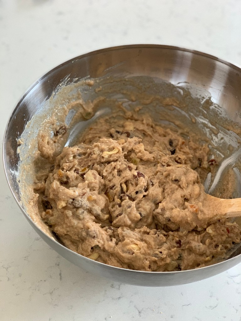 5. La final adăugăm stafidele, ciocolata rasă, coaja confiată. Omogenizăm. Avem o compoziție granulată.