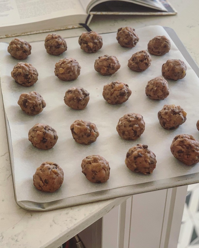 6. Formăm biluțe cât o nucă în palmă și le punem pe tavă, lăsând spațiu între ele.