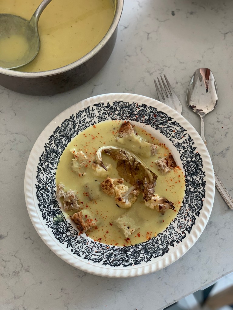 1. Într-o oală punem ceapa, ghimbirul, usturoiul, turmericul și jumătate din conopidă ruptă buchețele. Acoperim cu apă și punem la fiert pentru 25-30 de minute, până sunt bine fierte legumele.