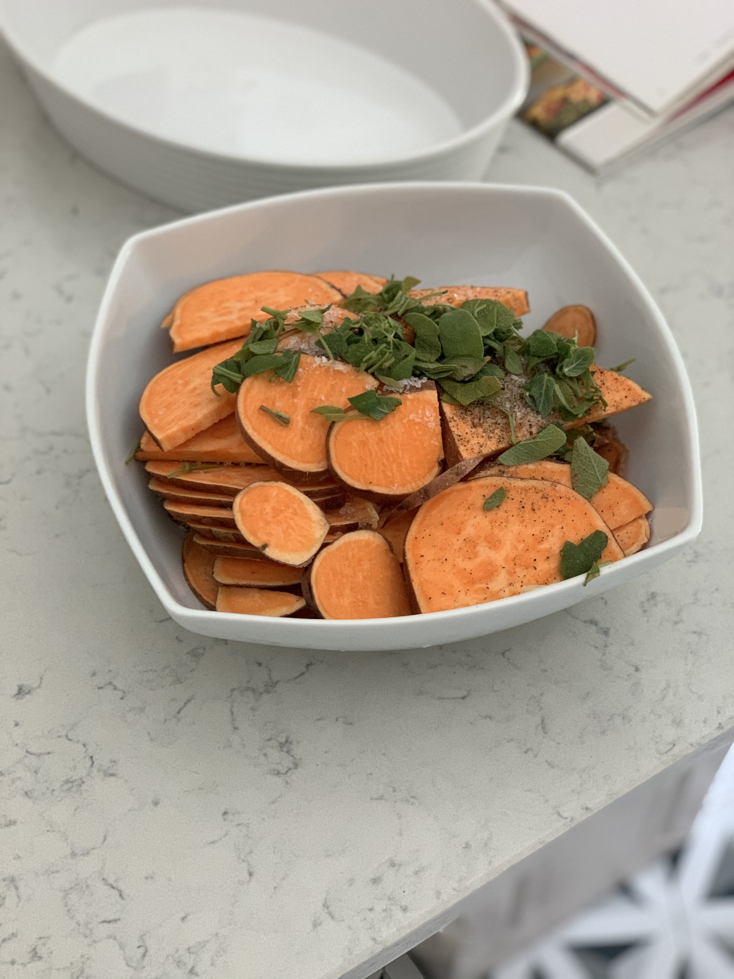 - 800 g cartofi dulci, feliați subțire, cu tot cu coajă (2 buc mari)