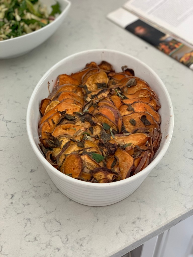 Îmi plac mult cartofii dulci, iar de-a lungul timpului i-am gătit în fel și chip. Gratinul de mai jos e super simplu de pregătit și ai nevoie doar de câteva ingrediente. Noi l-am mâncat la un prânz, alături de o salată din verdețuri.