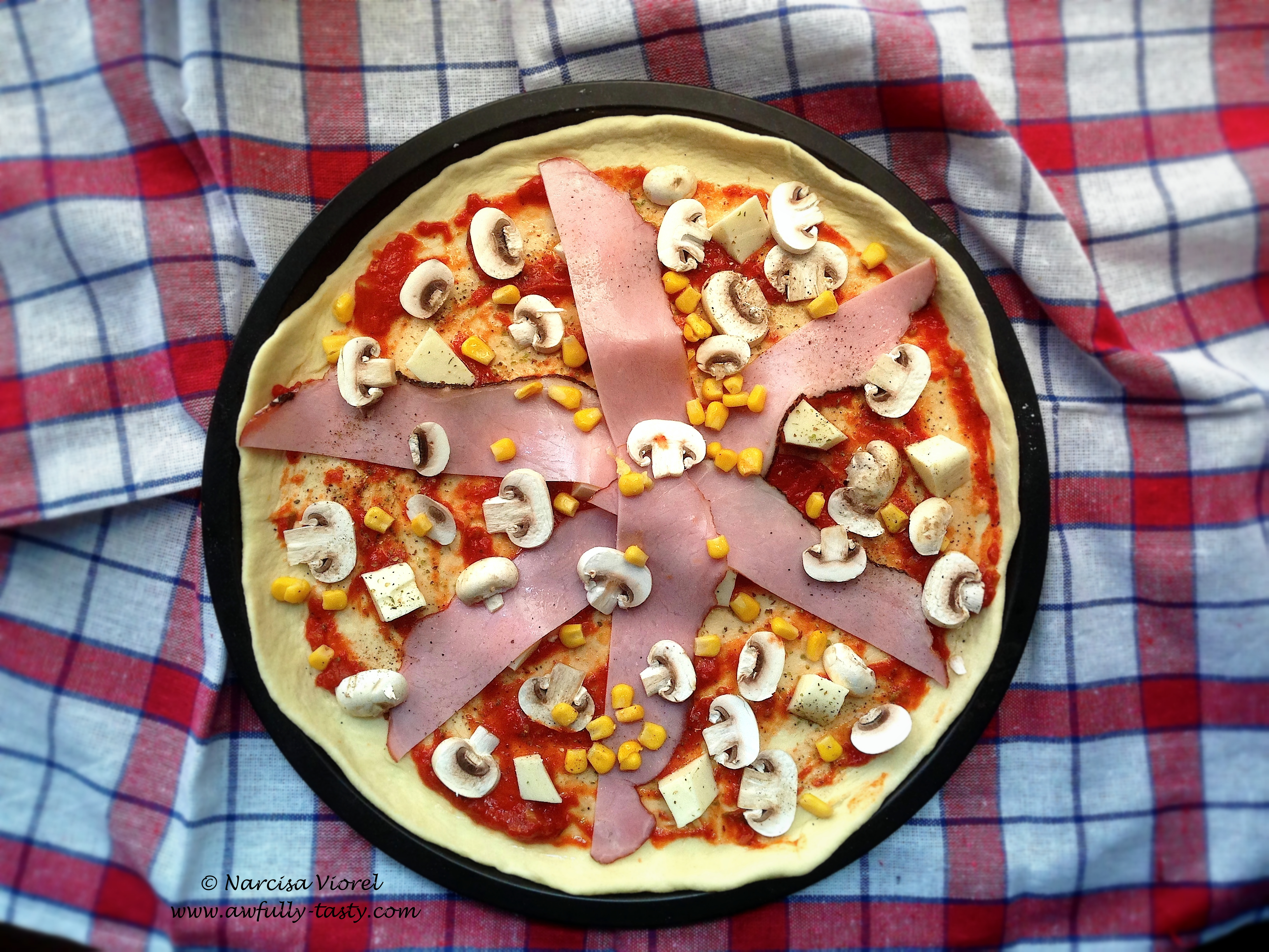 Împărțim aluatul în 3 părți. Întindem fiecare bucată de aluat într-o fâșie lungă-ovală foarte subțire. Pe mijloc așezăm alternativ bucăți de mozzarella, felii de roșii, șuncă și frunze de busuioc.