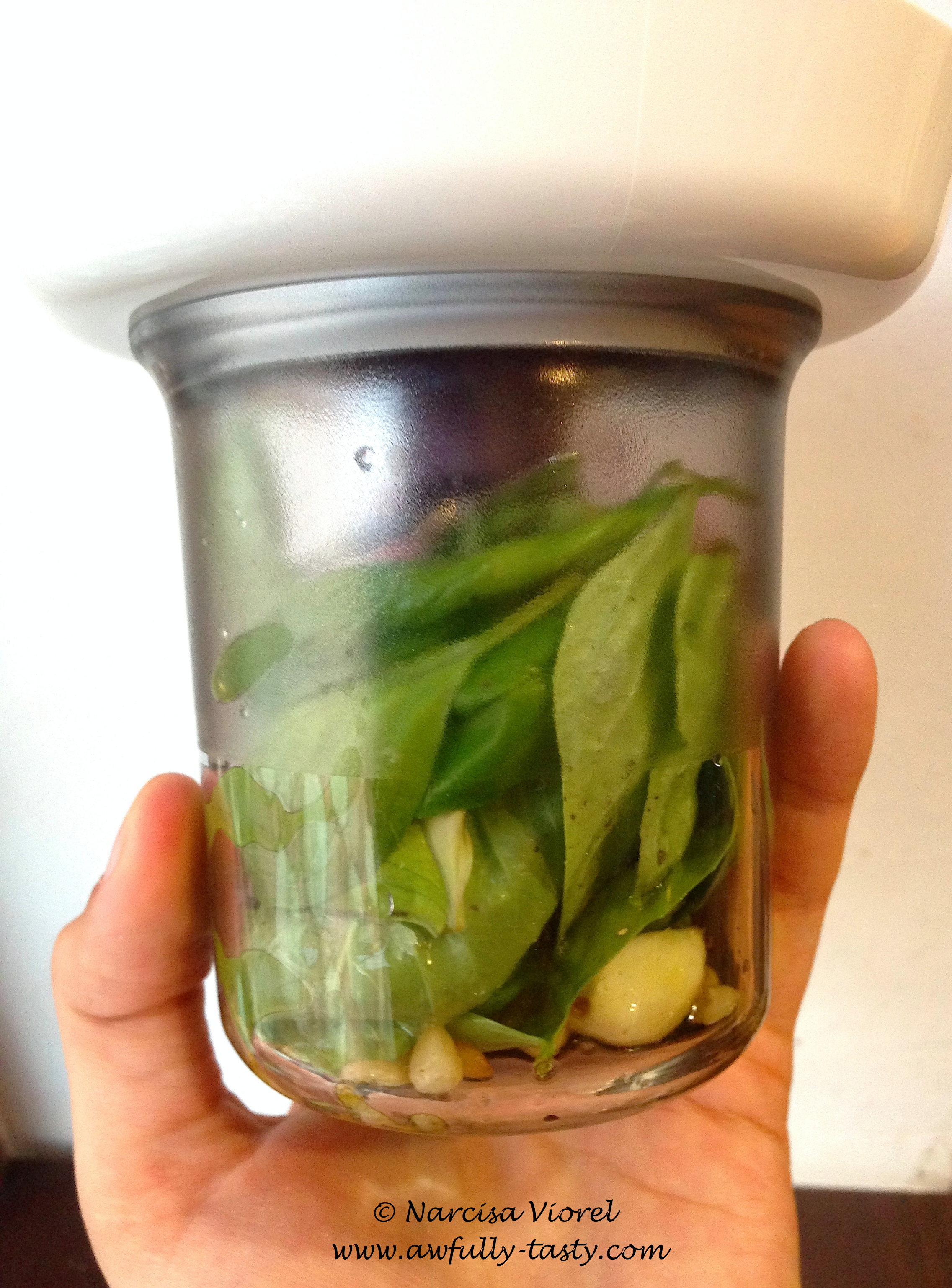 Avem nevoie de un mojar sau un robot de bucătărie. Trecem frunzele de busuioc sub un jet de apă, le punem în robot, adăugăm usturoiul, semințele de pin și uleiul de măsline.