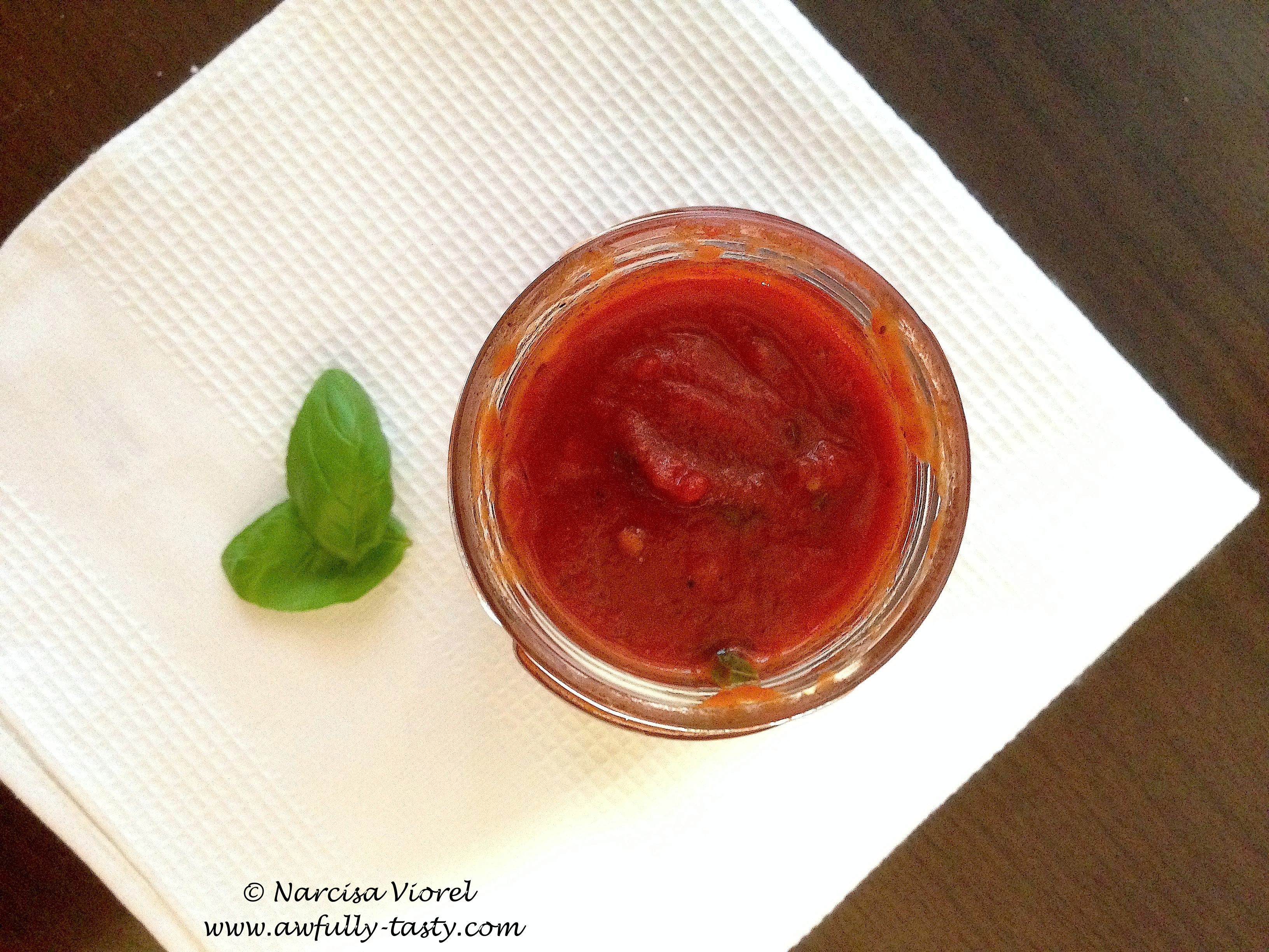 Într-o tigaie mare turnăm un ”gât” de ulei de măsline, adăugăm tulpinile de la busuiocul rămas, tocate, și usturoiul. Gătim 1 minut apoi adăugăm roșiile din conservă. Umplem o conservă cu apă și o adăugăm peste roșiile din tigaie. Fierbem timp de 15 minute, zdrobind roșiile cu o lingură.