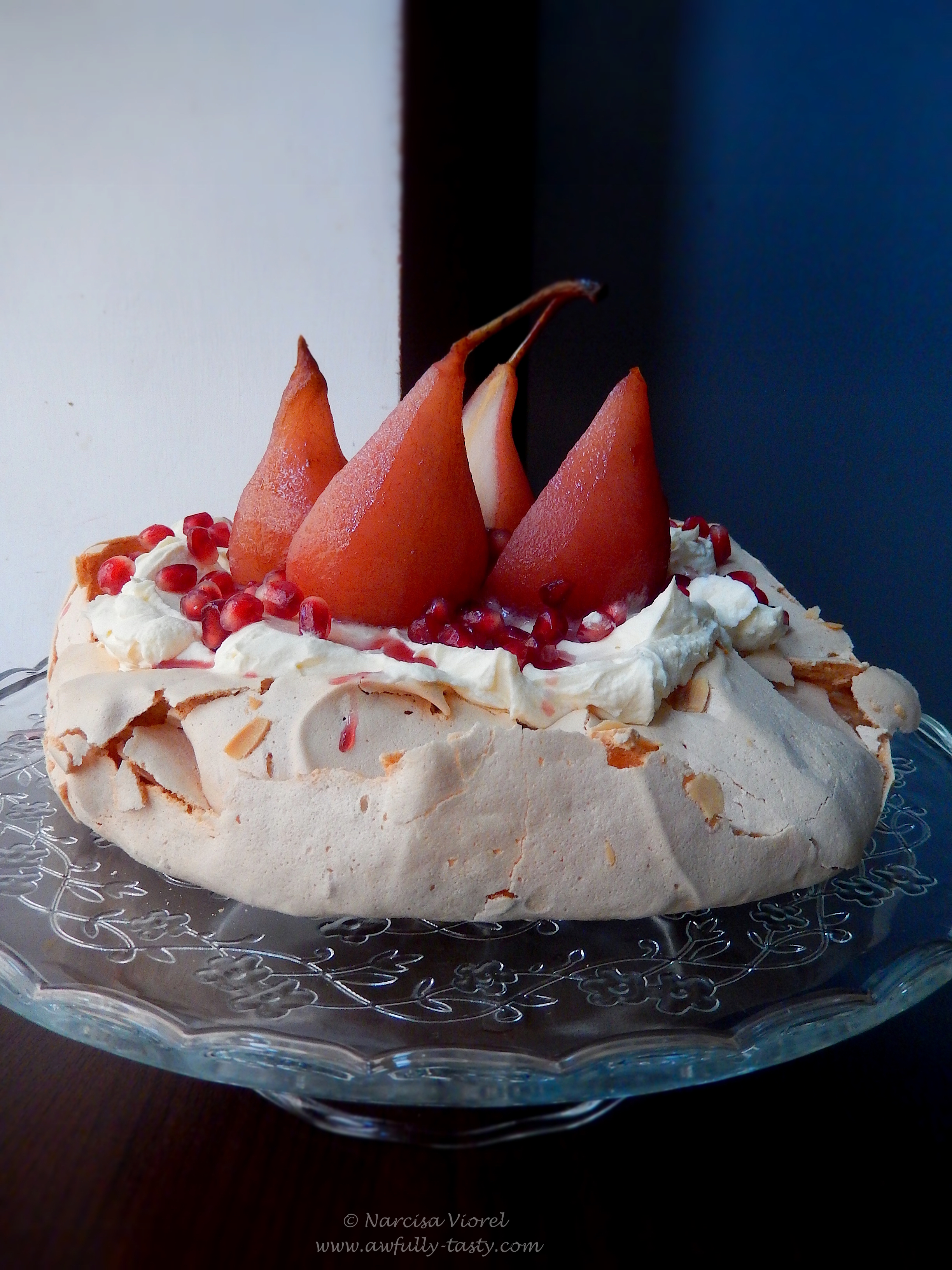 Ruladă de bezea umplută cu cremă de vanilie și ananas caramelizat.