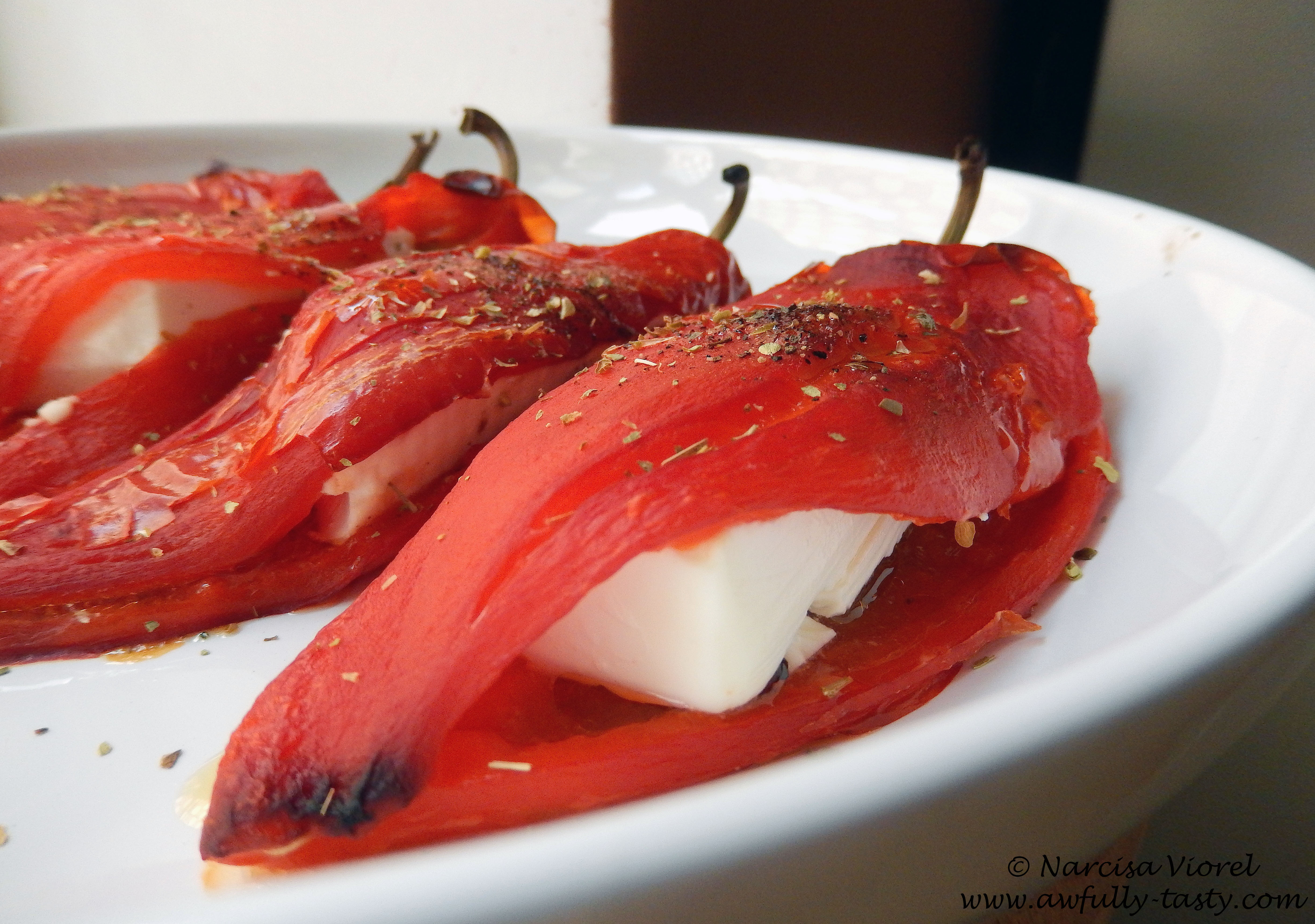 - Tăiem roșiile și ardei în sferturi, le punem într-o tavă și le asezonăm cu sare, piper, usturoi, ulei de măsline și cimbru.