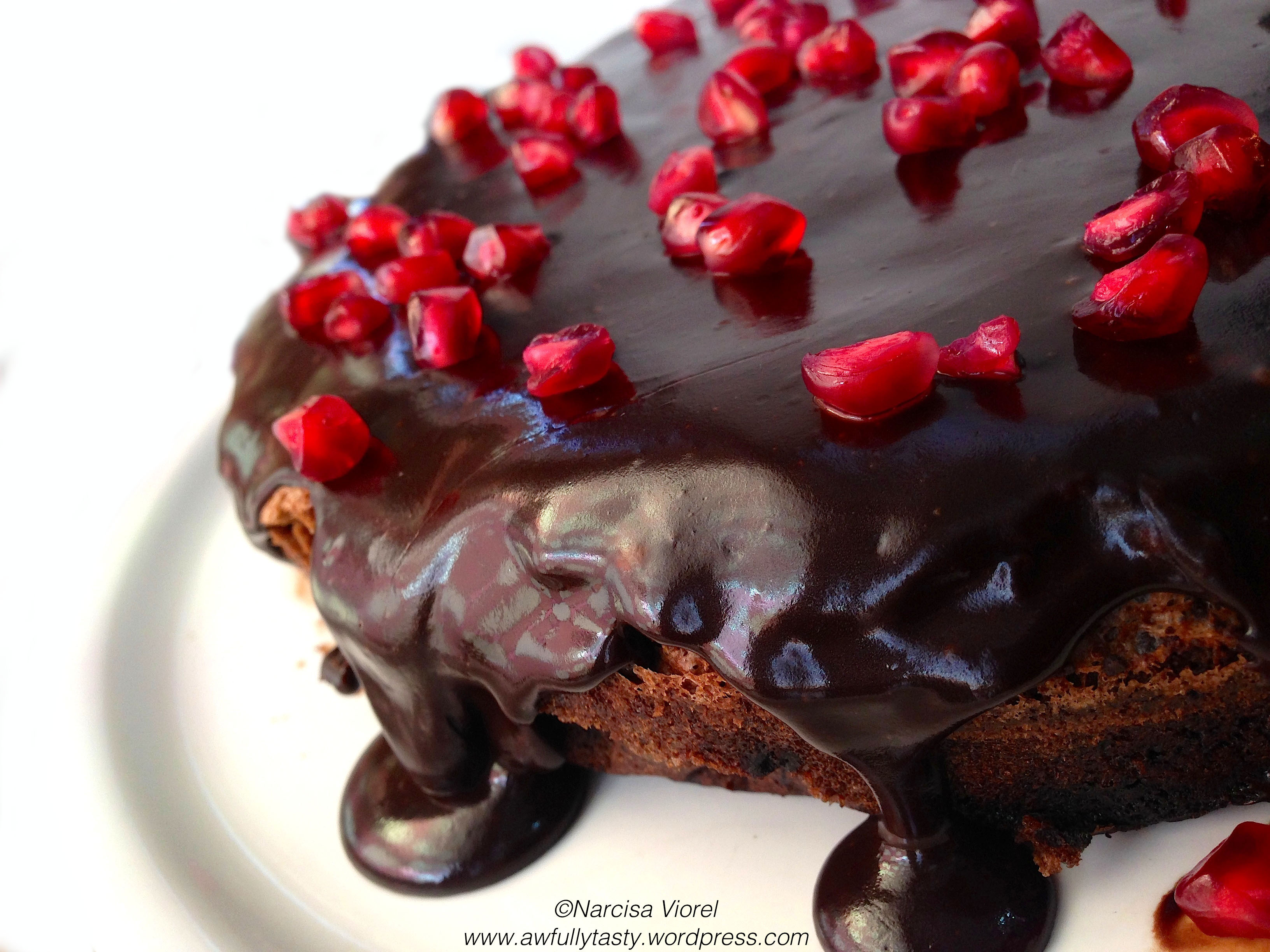 Pentru a face glazura, topim ciocolata cu smantana pe aburi.  Lăsăm puțin la răcit, apoi turnăm peste prăjitură. Decorăm cu semințele de rodie.