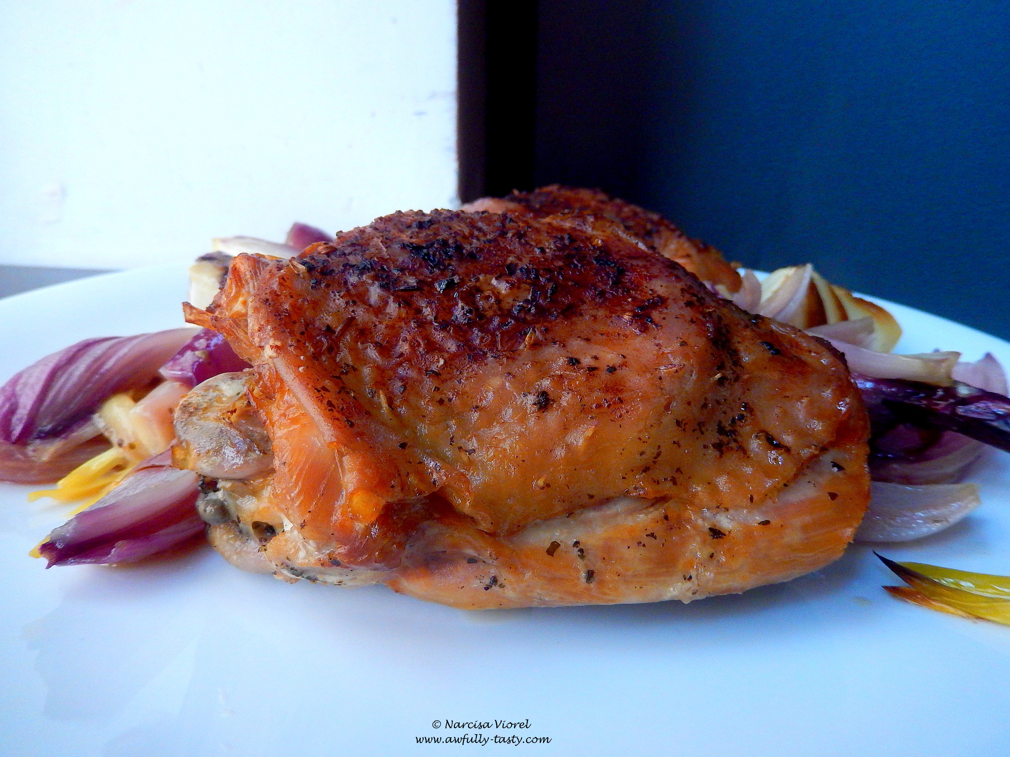 Acoperim tava cu folie de aluminiu și dăm la cuptor pentru 90 de minute. După 45 de minute întoarcem pulpele. Verificăm carnea care după cele 90 de minute, trebuie să fie bine pătrunsă.